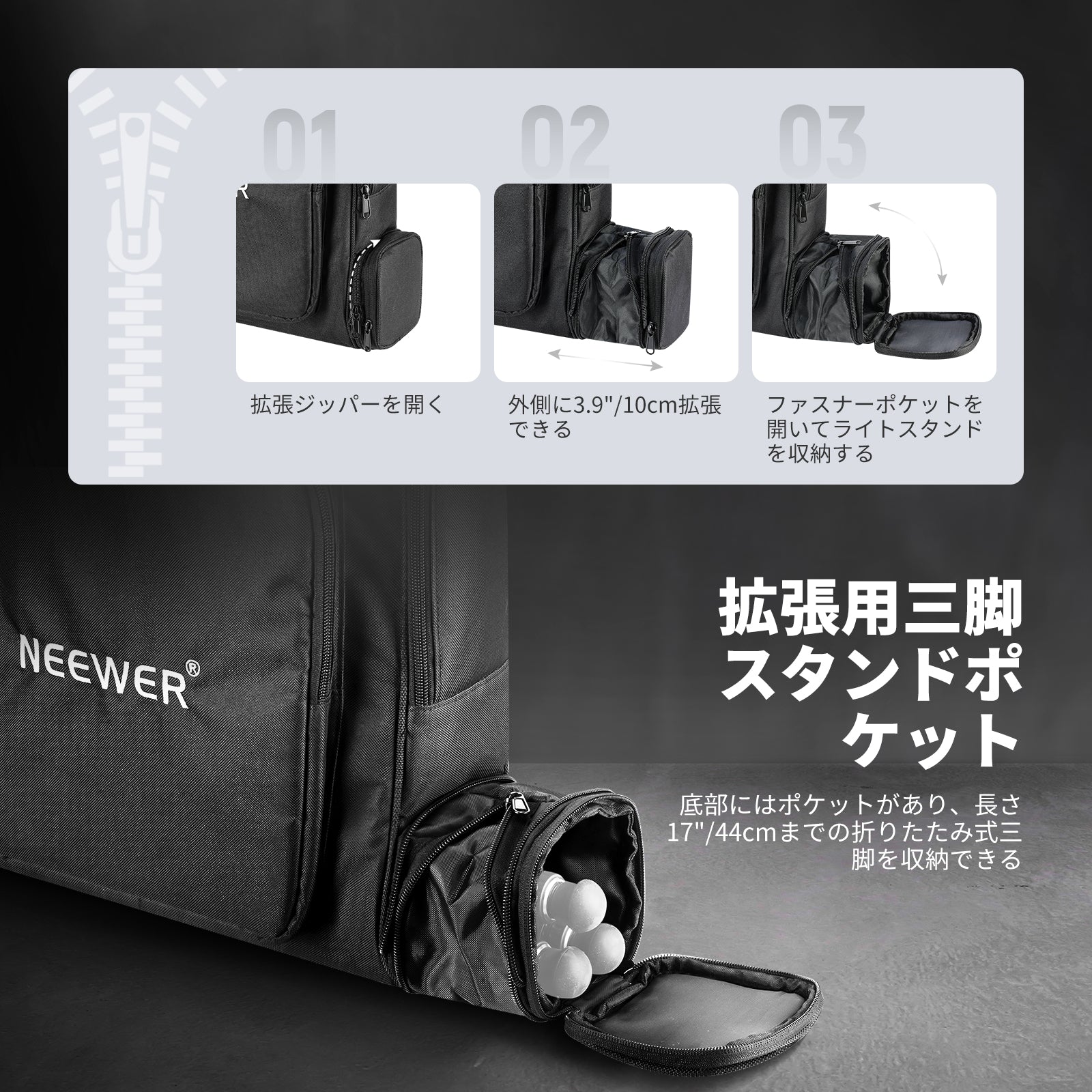 - 【折りたたみ三脚用独立したセクション】底部にはバーのような収納スペースがあり、最大17"/44cmまでの折りたたみ式ライトスタンドを収納できます。パッド入りの仕切りにより、衛星端末が金属スタンドから分離され、傷や破損を防ぎます。入り口には2つのジッパーが付いており、収納長さを調節でき、様々なサイズの三脚にぴったりとフィットします。