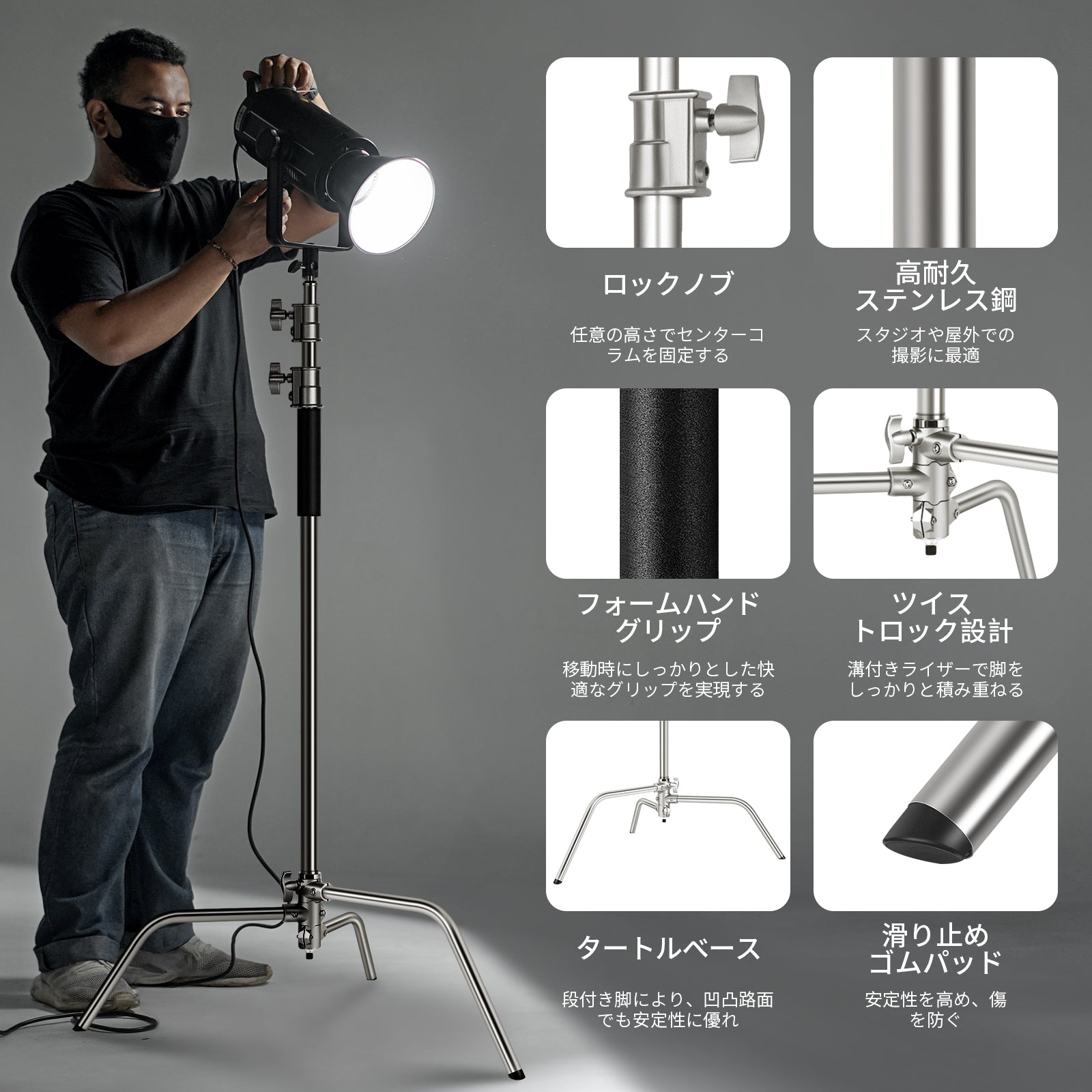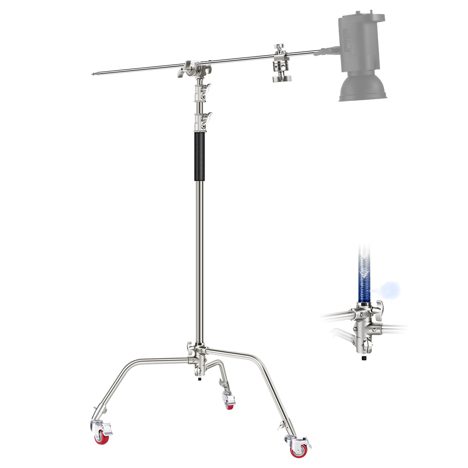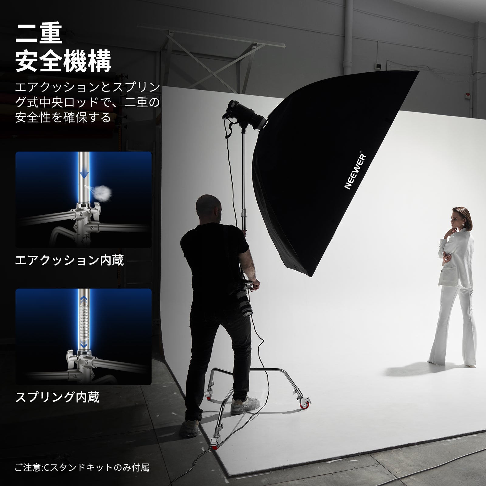 - 【二重安全機構】写真用 C スタンドはエアクッションとバネ仕掛けセンターロッドを採用し、ストロボライトなどの重い機材が倒れたり、下がったりする際の落下を防ぎ、機材を傷つける可能性を低減し、二重の安全性を実現しました。