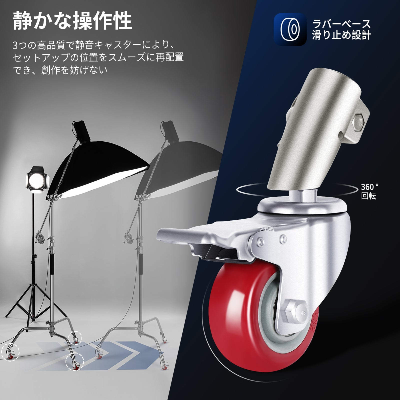 - 【静音操作】静かなローラーでスタジオを楽に移動できます。3 つの高品質で騒音のないキャスターにより、創造的なプロセスを妨げることなくセットアップをスムーズに位置変更できます。