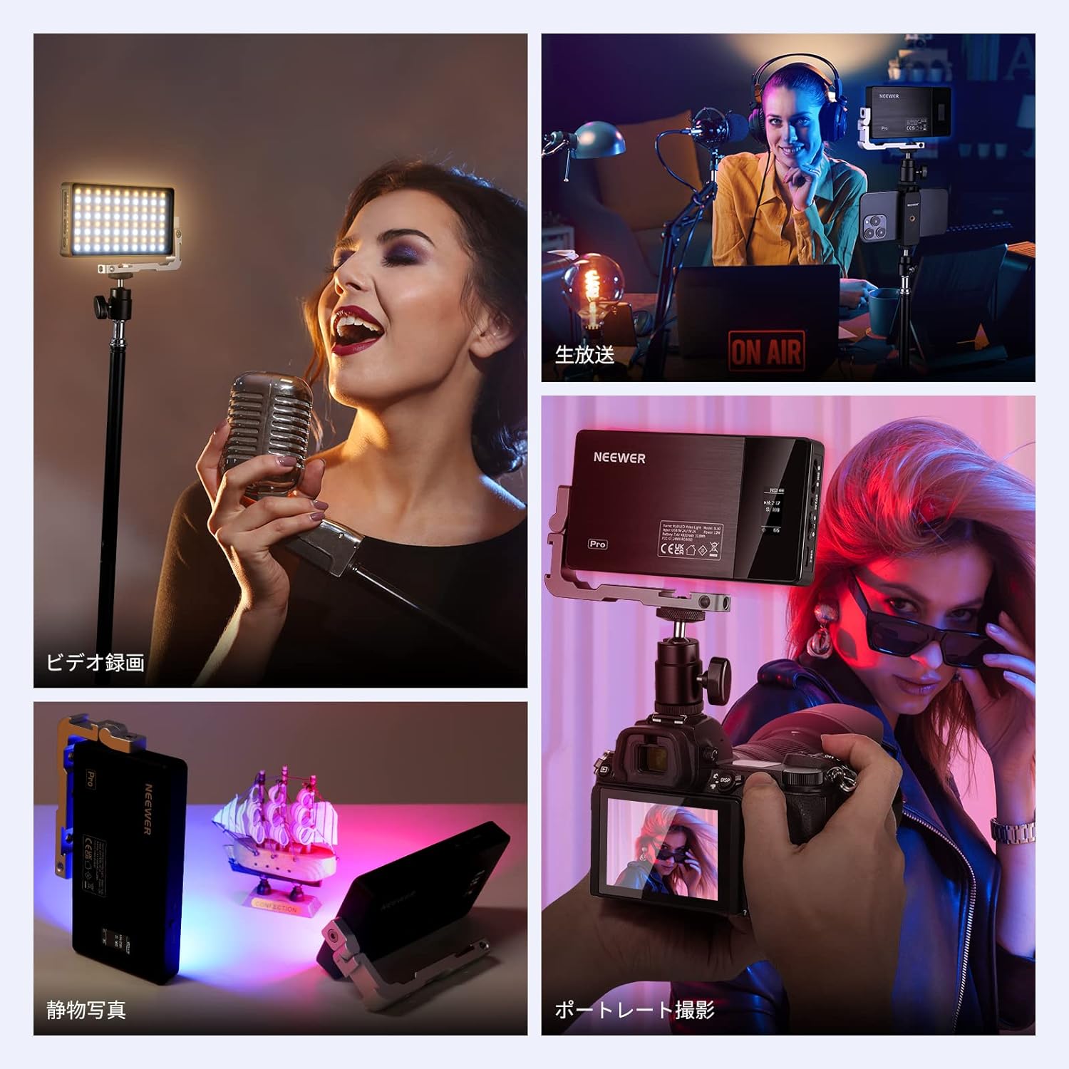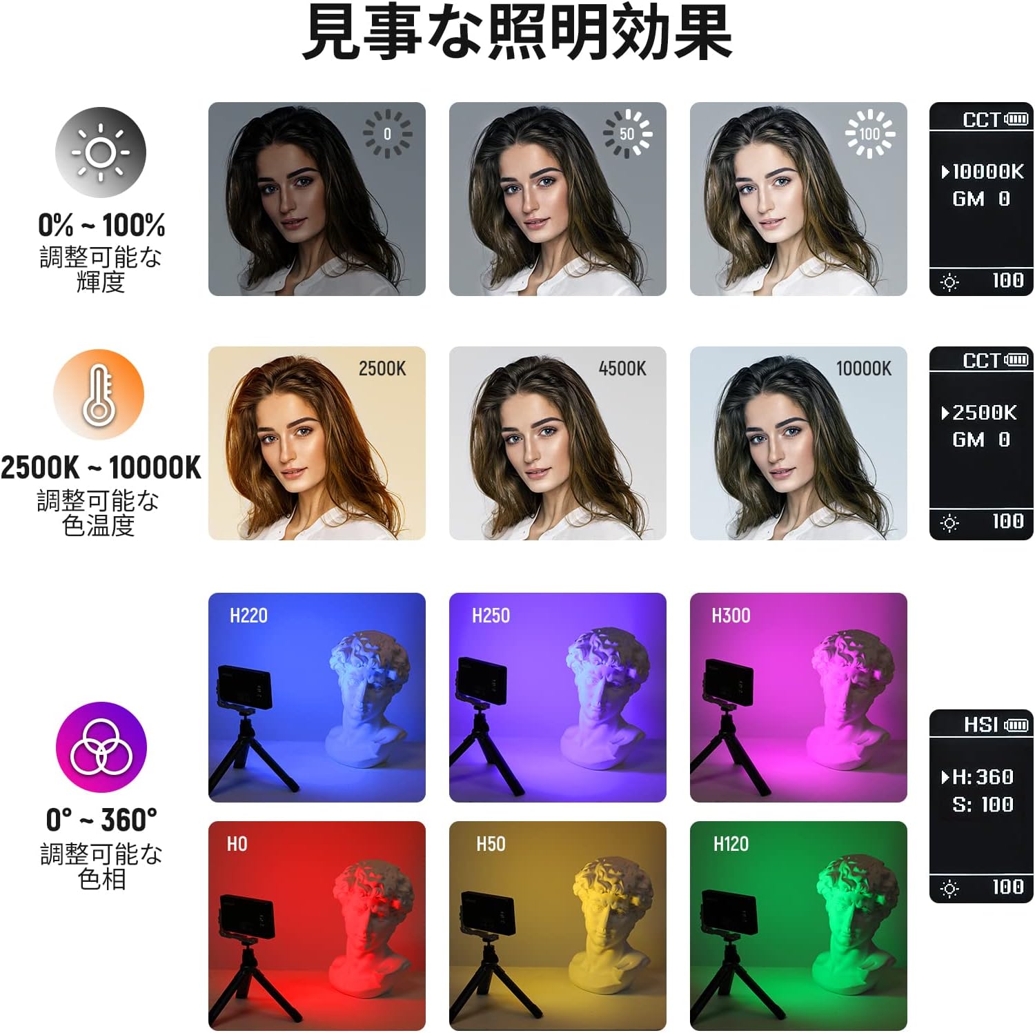 - 【見事な照明効果】 この12W RGB LEDライトパネルは、最大輝度1,700ルクス(0.5m)の80個のバイカラーLEDと70個のRGB LEDを備えています。 360° フルカラー RGB ライトは、正確な色再現のために 97+ の高い CRI および TLCI 定格を備えています。内蔵の 7.4V 4300mAh 充電式バッテリーは、最大 3.5 時間の連続点灯 (100% の明るさ) をサポートします。色温度は 2500K (暖かい白) から 10000K (冷たい白) まで調整可能です。