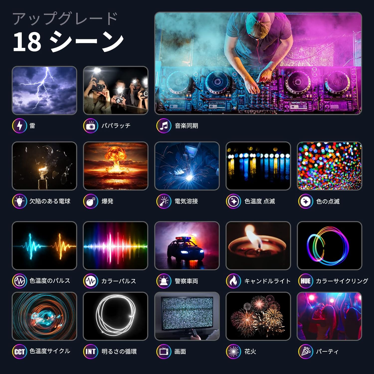 - 【18 シーン モード & 音楽同期をサポート】18のプリセット照明シーンモードにアップグレードして、ビデオ作成に人目を引く要素を追加します。注目の音楽設定では、音色と音量に基づいてカラフルでダイナミックな方法でスマートライトを音楽と同期させ、ビデオに雰囲気を追加します。設定のコンテキストと照明に基づいたアプリでのグリーン マゼンタ調整のサポートにより、よりグリーンに、よりマゼンタに、より正確なキャリブレーションを行うことができます。最適な照明を得るには、被写体に近づけてください (4.9ft/1.5m以内)。