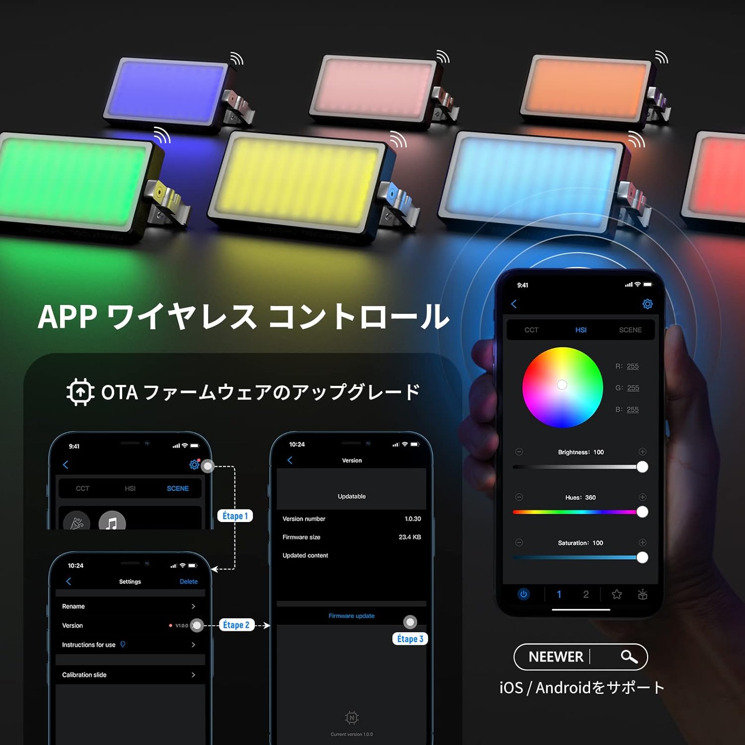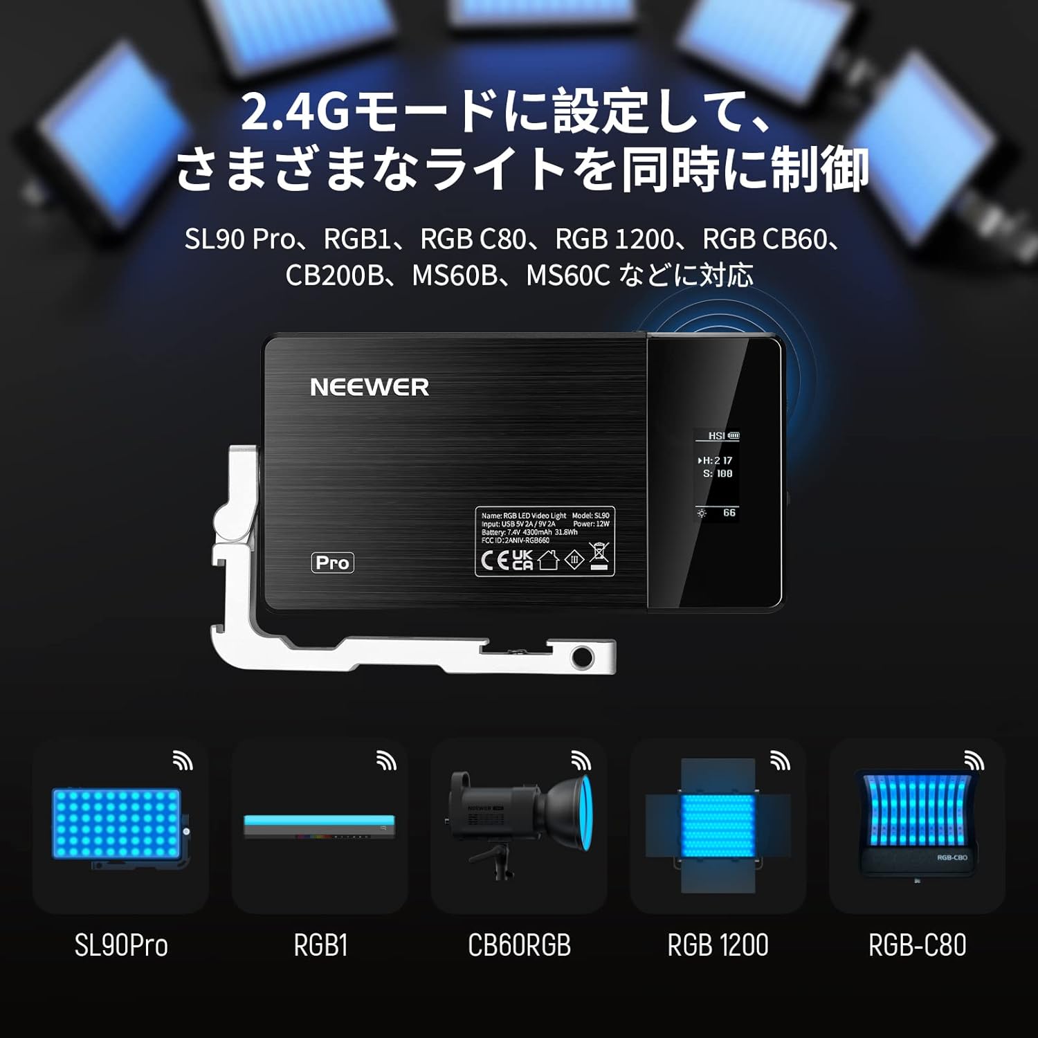 - 【新しい無限接続技術】NEEWERの新しい無限接続テクノロジーは、1つのライトをマスターライトとして設定することをサポートし、マスターライトへの設定は、同じ2.4Gグループに設定されたレシーバーライトに同期して適用されます(1つのグループは最大255のデバイスを使用できます) )。 NEEWER SL90、RGB1、RGB C80、RGB 1200、RGB CB60の新モデルに対応できます。