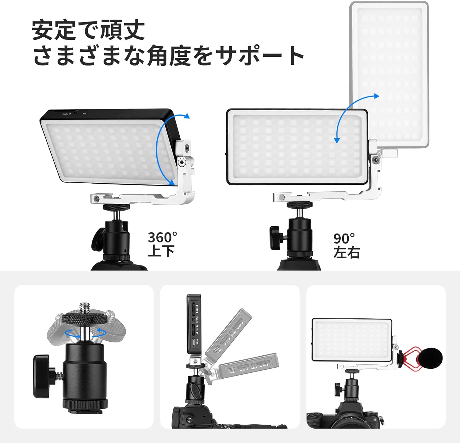 - 【パンとチルト調整可能なアルミニウム合金ハウジング】 SL90 LED パネル ライトには、回転可能なスイベル アーム (360° チルトと 90° パン) とコールド シュー取り付けポイントが装備されています。 さまざまな角度で上下に跳ね上げることができ、抵抗と安定性に優れています。 アルミニウム合金構造により、耐久性が保証されます。