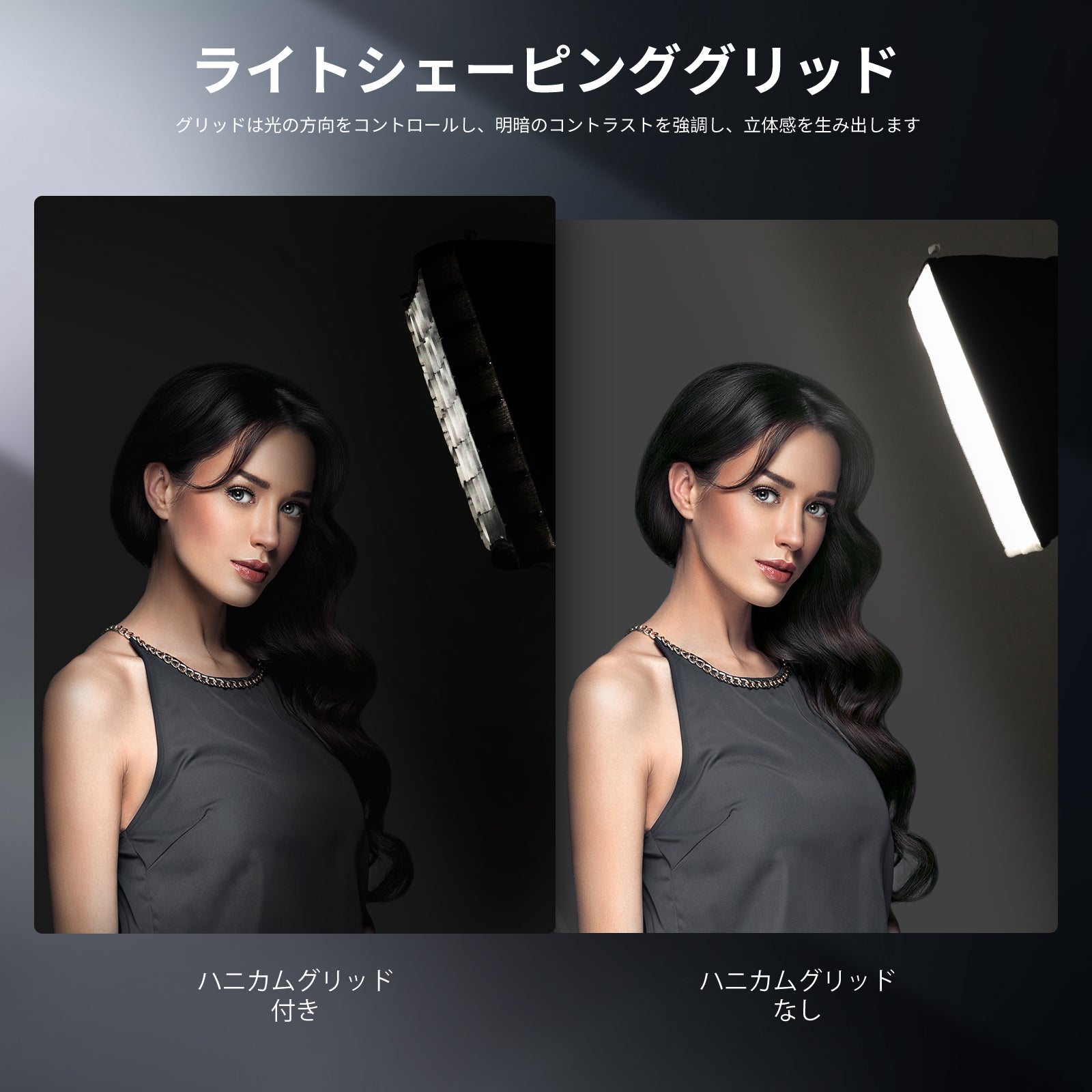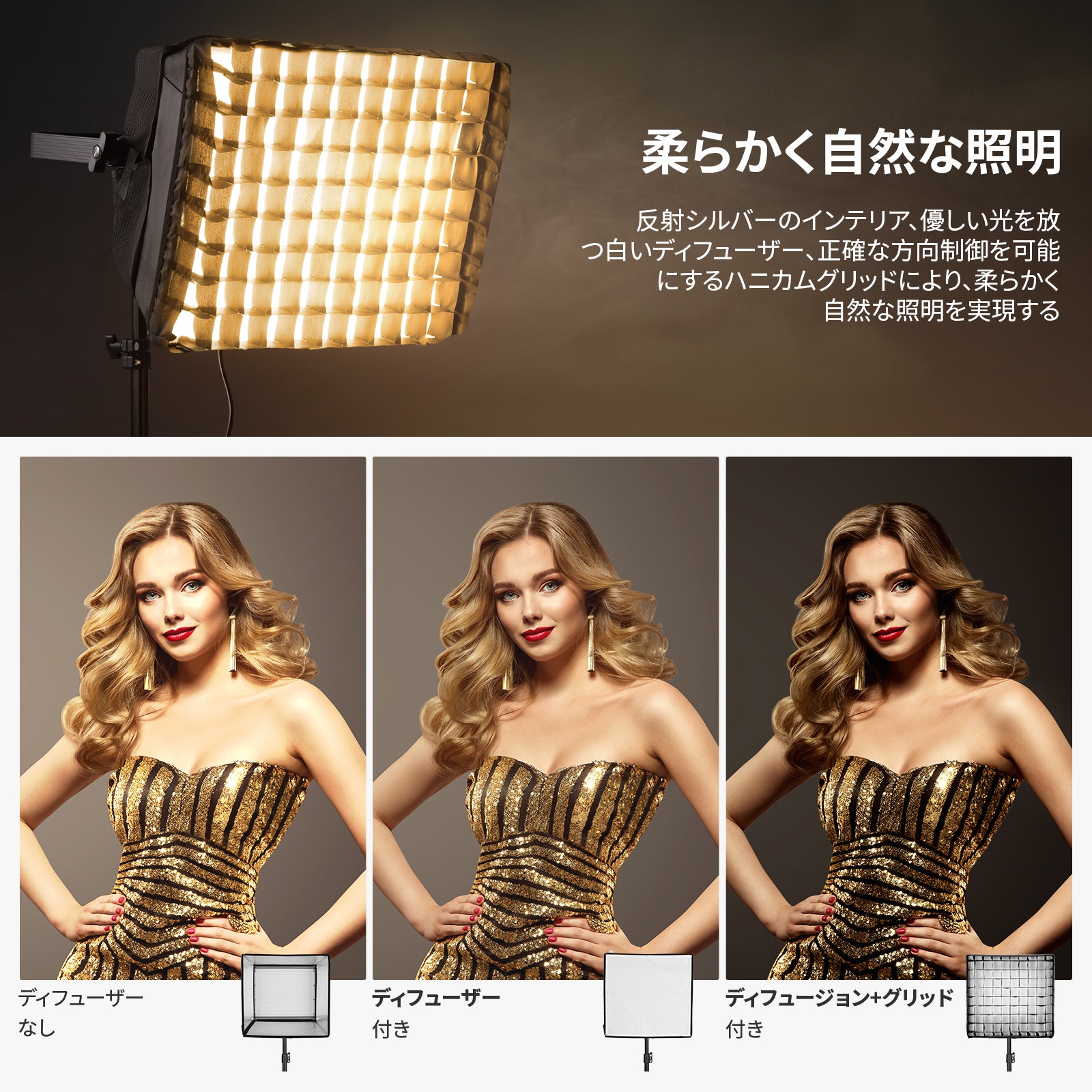【ディフューザーとグリッドによる柔らかで自然光】反射率が高く、均一にコーティングされたシルバーの内面は、色の正確さを保ちながら、光の拡散を広げ、強化します。付属の白いディフューザーは、強いまぶしさを和らげ、不要な影を取り除きます。ハニカムグリッドは、肖像写真の照明効果を柔らかく、かつ明確にするために光を集中させ、出力に対するより大きな方向制御を与えます。