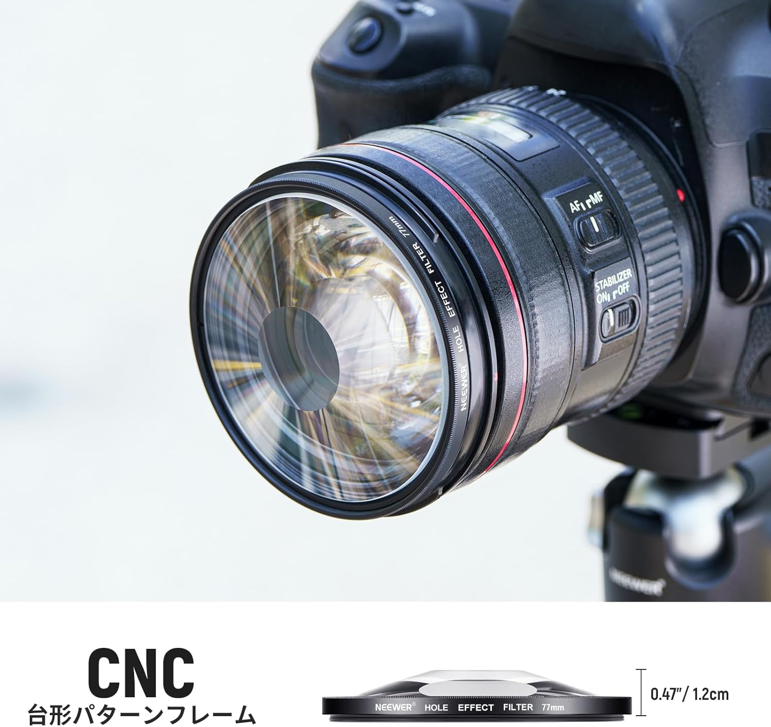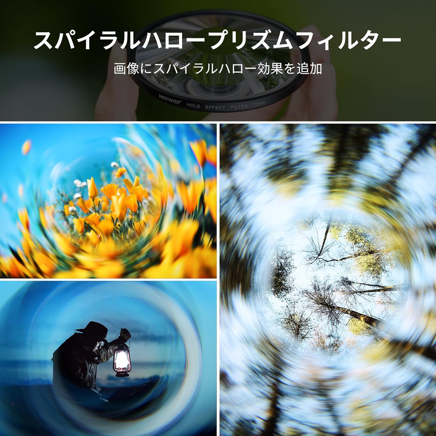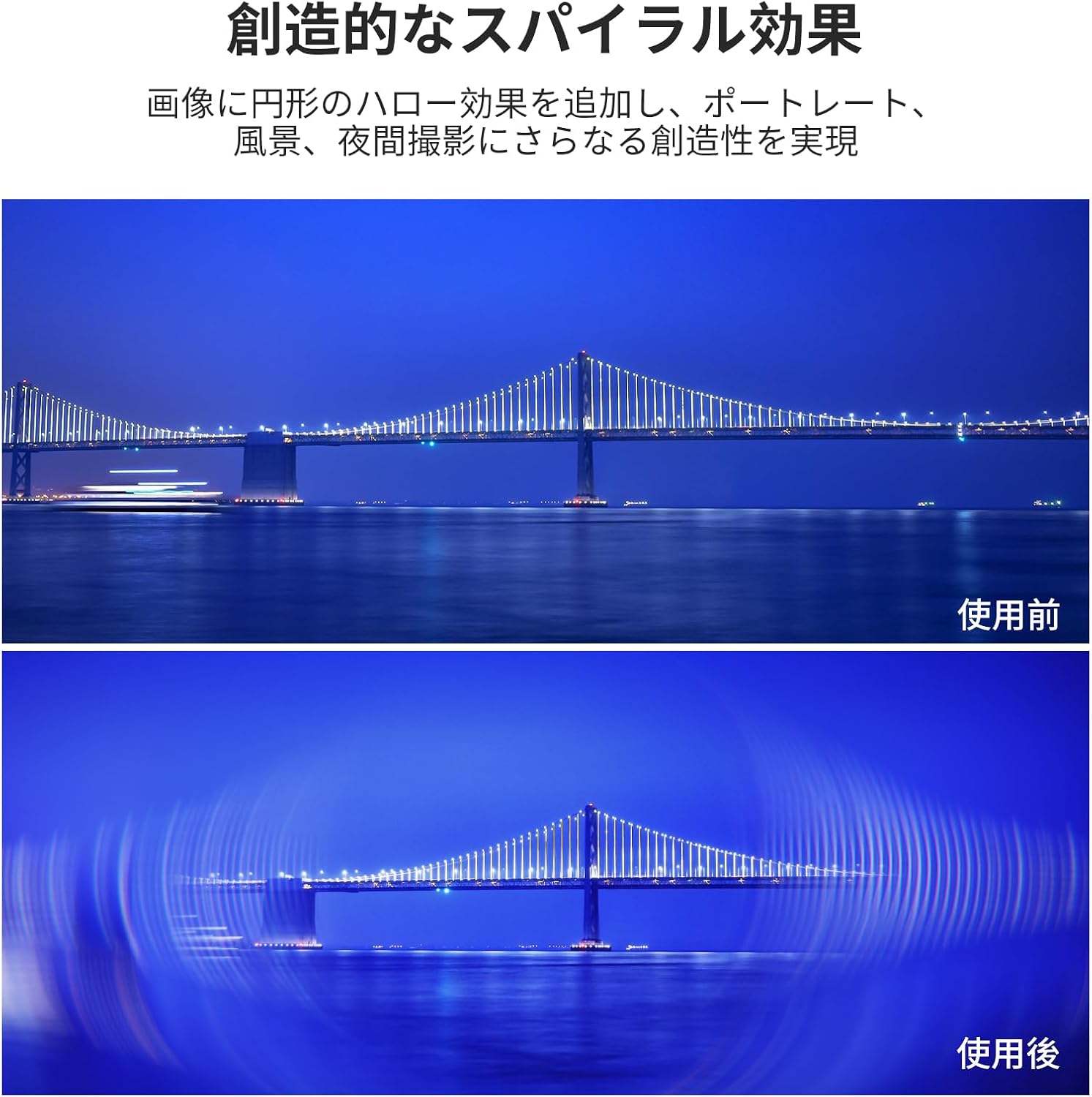 - 【魅惑のスパイラルハロー効果】このプリズム効果フィルターは、円形のハローでショットをフレーミングし、中央ステージの画像を鮮明に保ちながら、背景を渦巻くズームインされたぼかしに変えて、後編集することなくムードと雰囲気を高めます。