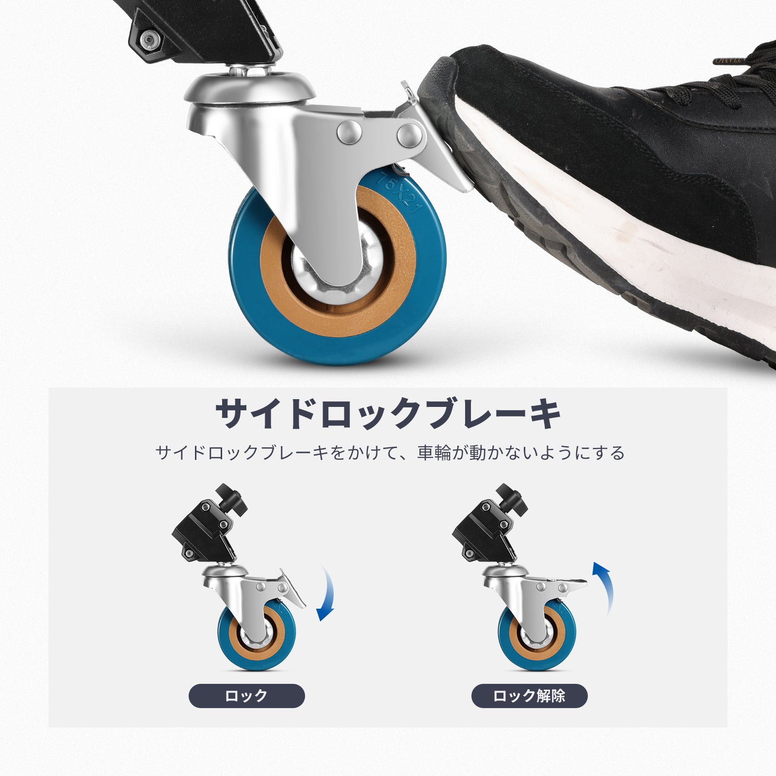 - 【足踏み式フットブレーキロック】ブレーキをかけるだけでキャスターがロックされ、三脚の動きを瞬時に止めます。機材を安定させ、最適な撮影を可能にします。
