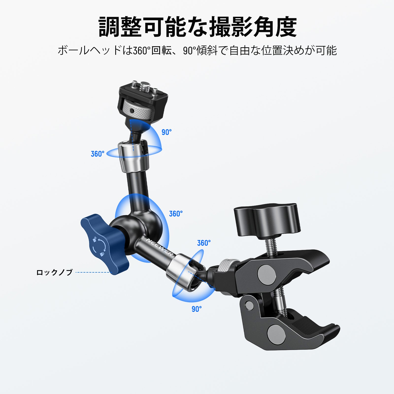 - 【360°デュアルボール雲台で多彩な角度に対応】各ジョイントアームはUノッチ付きボールヘッドを備え、360°回転と90°傾斜調整が可能で、拡大レバーを使用して任意の角度で固定でき、安定性と正確な位置決めを保証します。