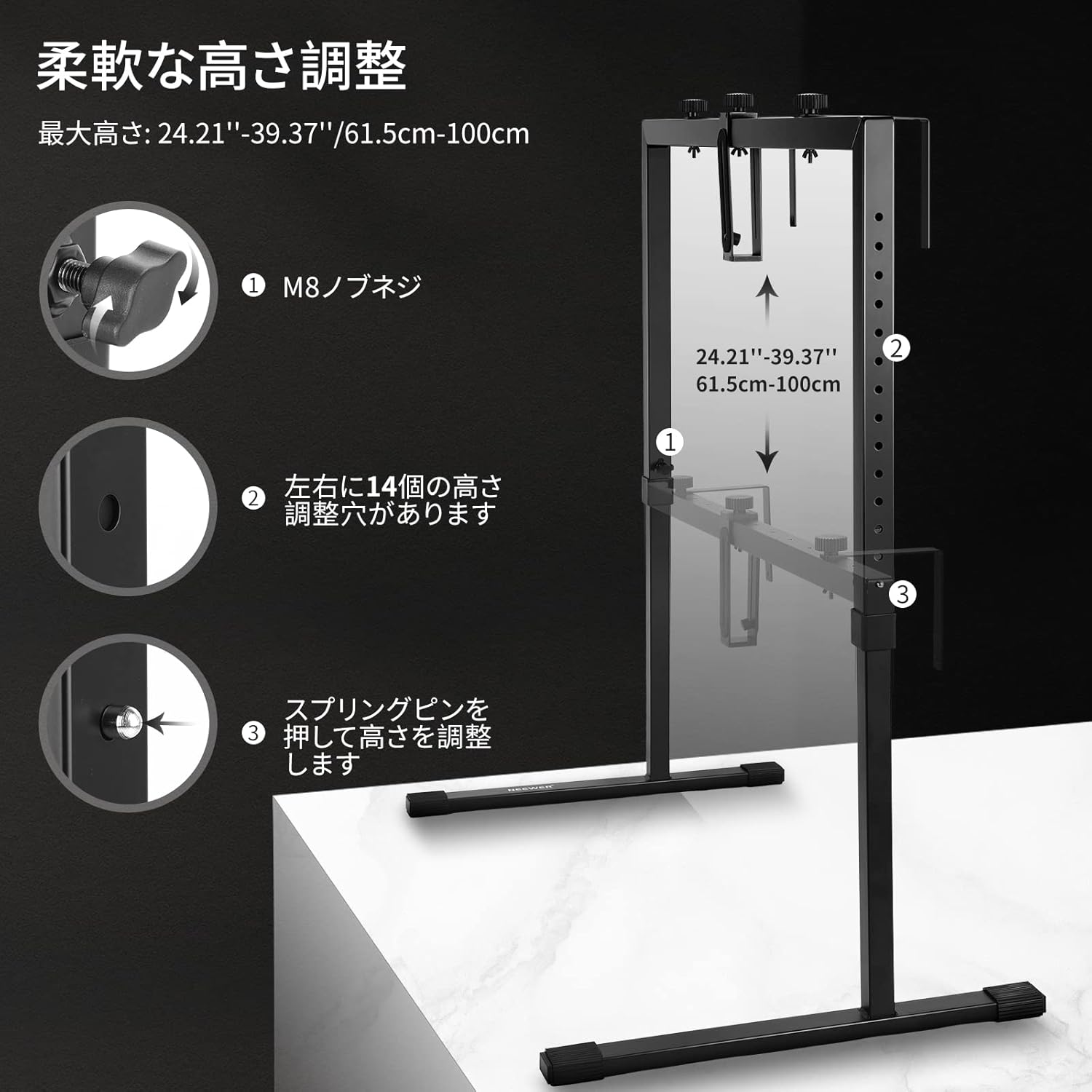 - 【スプリング式高さ調節コラム】各サイドコラムには、高さ調整用の14の位置決めポイントがあります。スプリング式ピンとM8ネジを使用して、さまざまな撮影要件に基づいて、高さを24"~39" (61.5~100cm)の範囲で簡単に調整できます。また、追加のスーパークランプやその他のアクセサリを購入して、サイドカラムを柔軟かつ効果的に拡張することもできます。