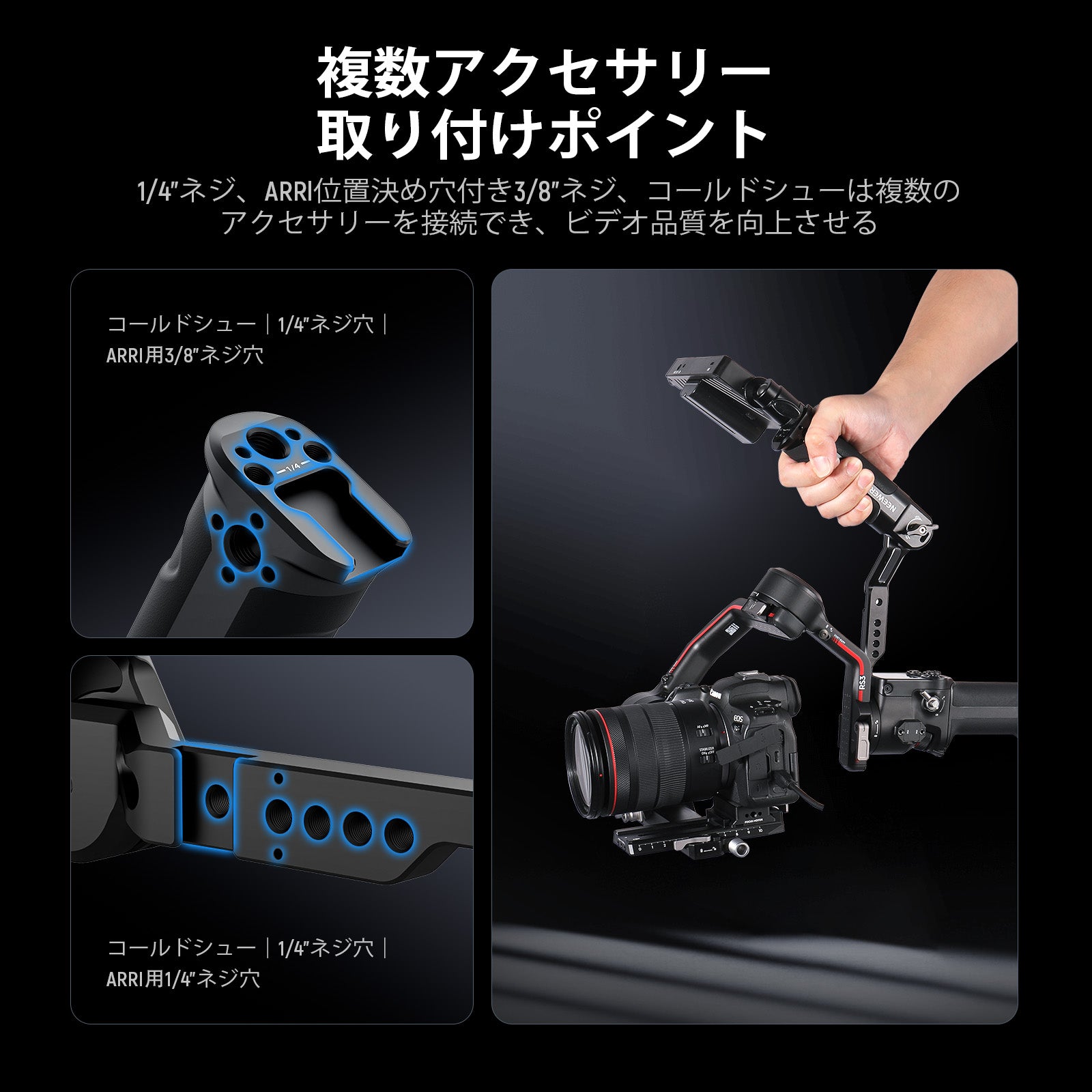 - 【複数のアクセサリー取り付けポイント】1/4"ネジ、ARRI位置決め穴付き3/8"ネジとコールドシューにより、複数のアクセサリーを接続し、ビデオ品質を向上します。アクセサリーには、CM14 Proマイク、PL81 LEDビデオライト、ST25マジックアーム、MA006モニターマウント、F500フィールドモニターが含まれます。