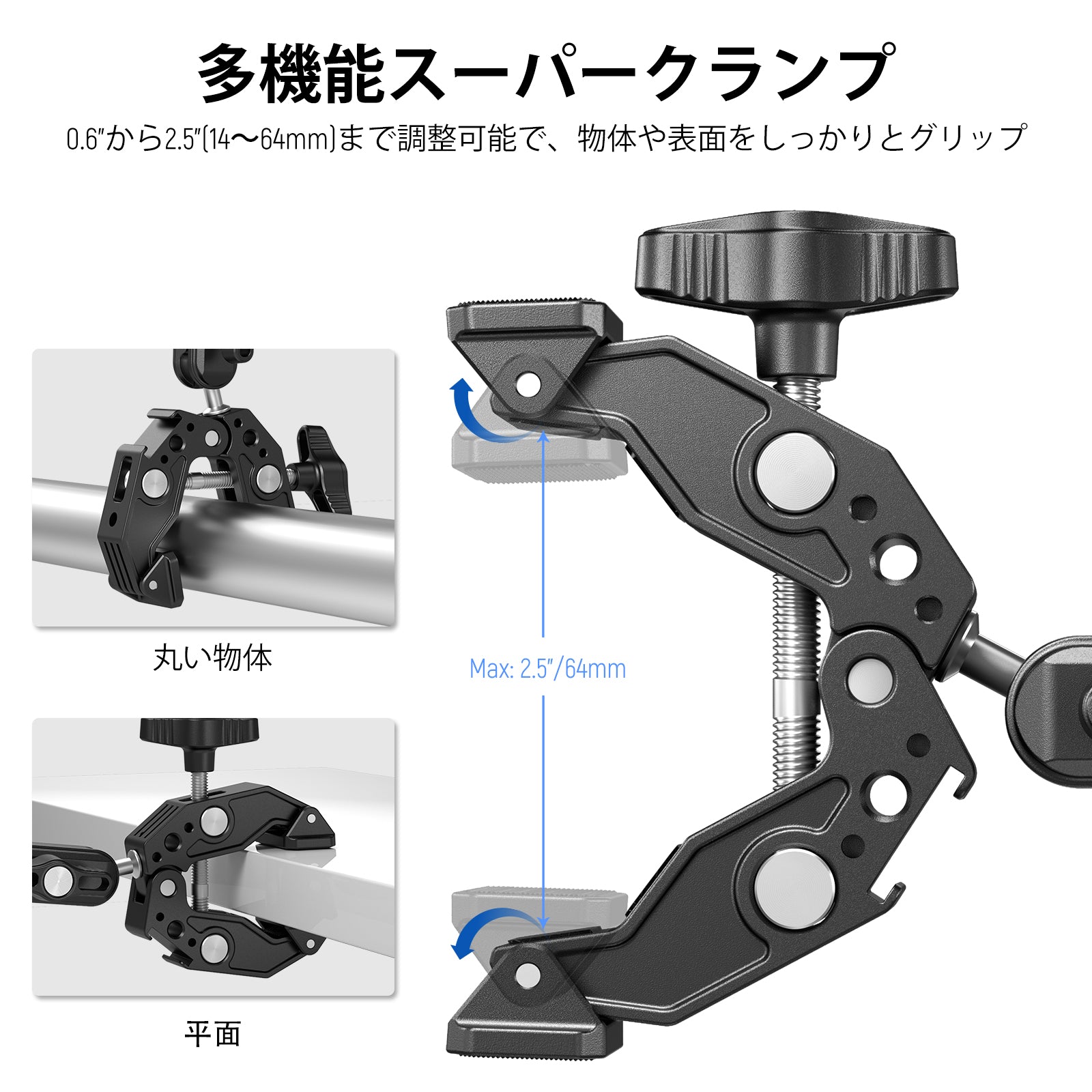 【平面と丸柱クランプ】スーパークランプは、直径0.6"-2.4"(14-60mm)の物体をつかむことができます。デスク、自撮り棒、三脚、ライトスタンド、ショルダーリグ、自転車のハンドルバーなどの平らな物体や円筒形の物体に固定できます。DJI Ronin-M Ronin MX & Freefly Movi 25mmおよび30mmジンバルスタビライザーロッドに対応します。V字型の溝とピボットチップにはシリコンゴムが充填されており、安定性が向上し、傷から保護します。