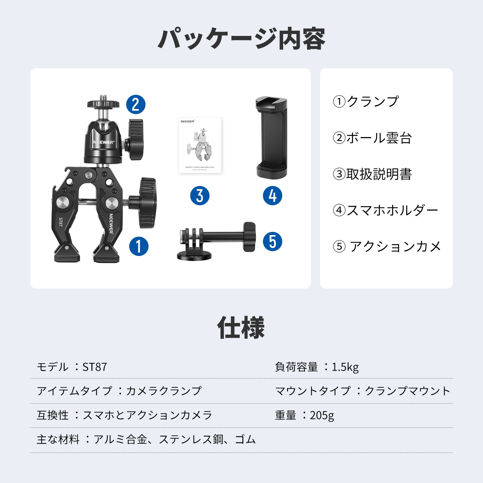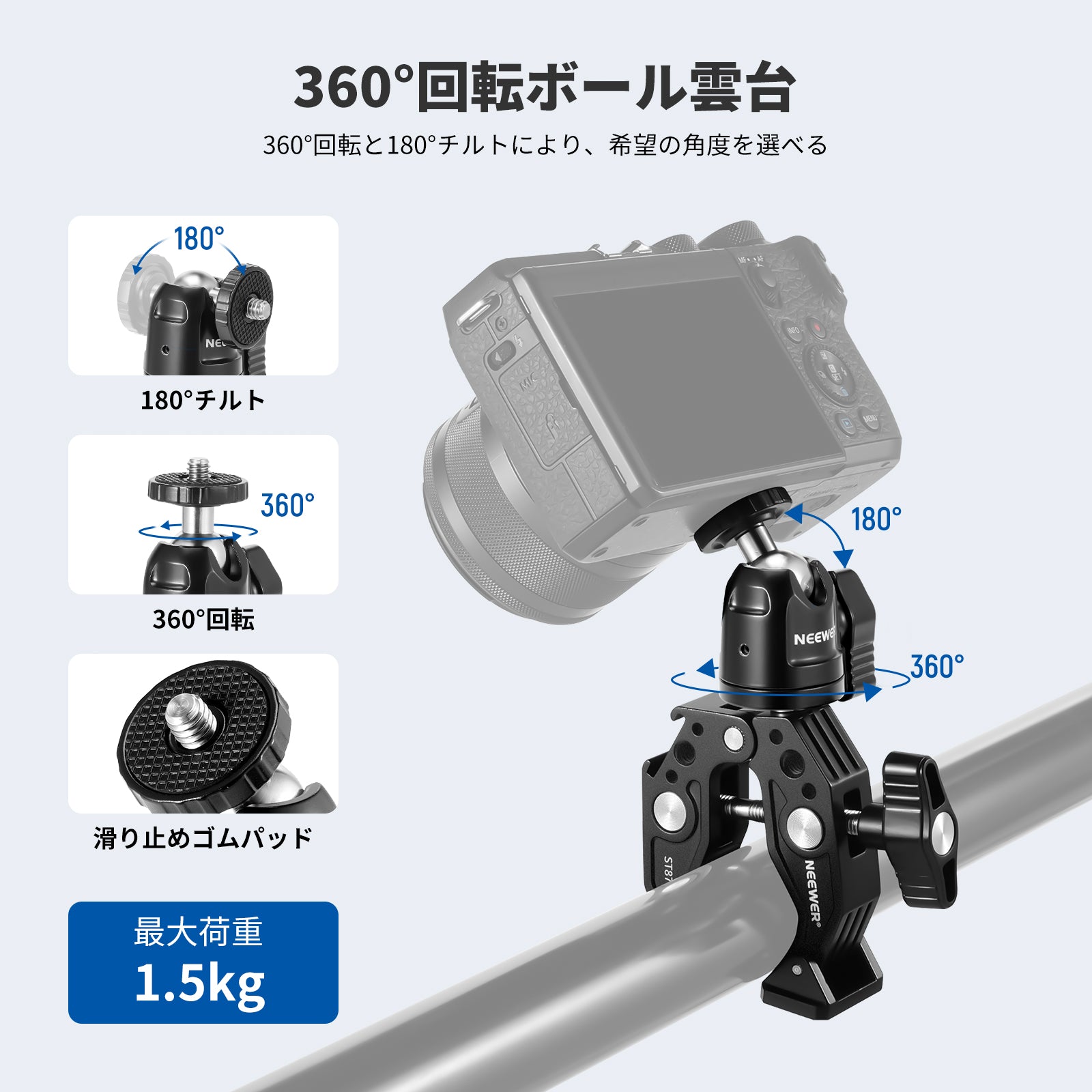 - 【頑丈な材質】頑丈なアルミ合金製で、耐久性と多用途です。仕事撮影でも屋外活動でも、しっかりと固定できます。クランプ内部のゴムパッドは、クランプの把持強度を向上させます。最大荷重は1.5kgです。