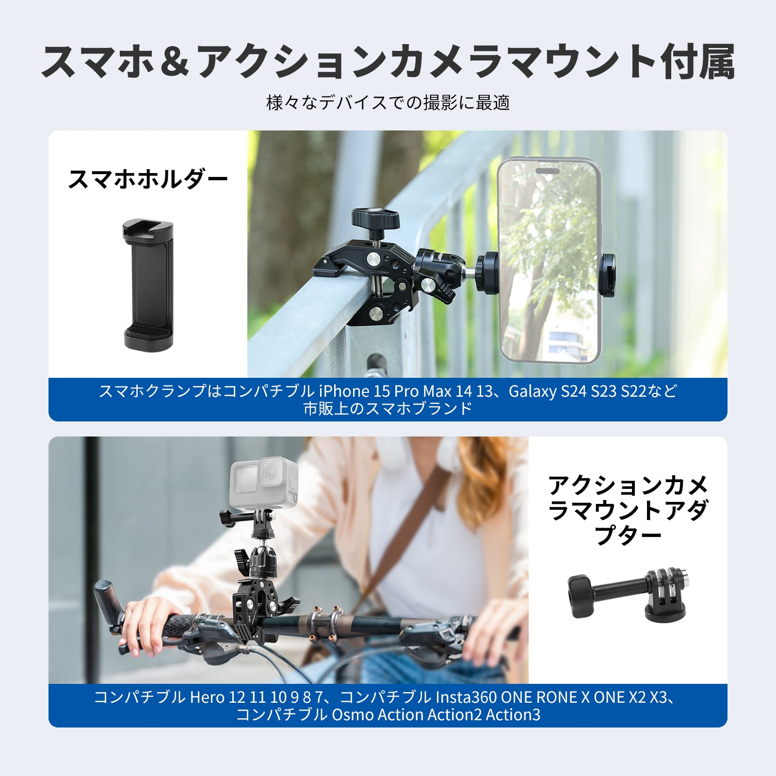 - 【アクションカメラ/スマホ用】汎用アクションカメラマウントアダプターはコンパチブル Hero 12 11 10 9 8 7、コンパチブル Insta360 ONE RONE X ONE X2 X3、コンパチブル Osmo Action Action2 Action3など。2"-3.3"(5-8.5cm)調節可能なスマホクランプはコンパチブル iPhone 16 15 Pro Max 14 13、コンパチブル Galaxy S24 S23 A22など市販上のスマホ。