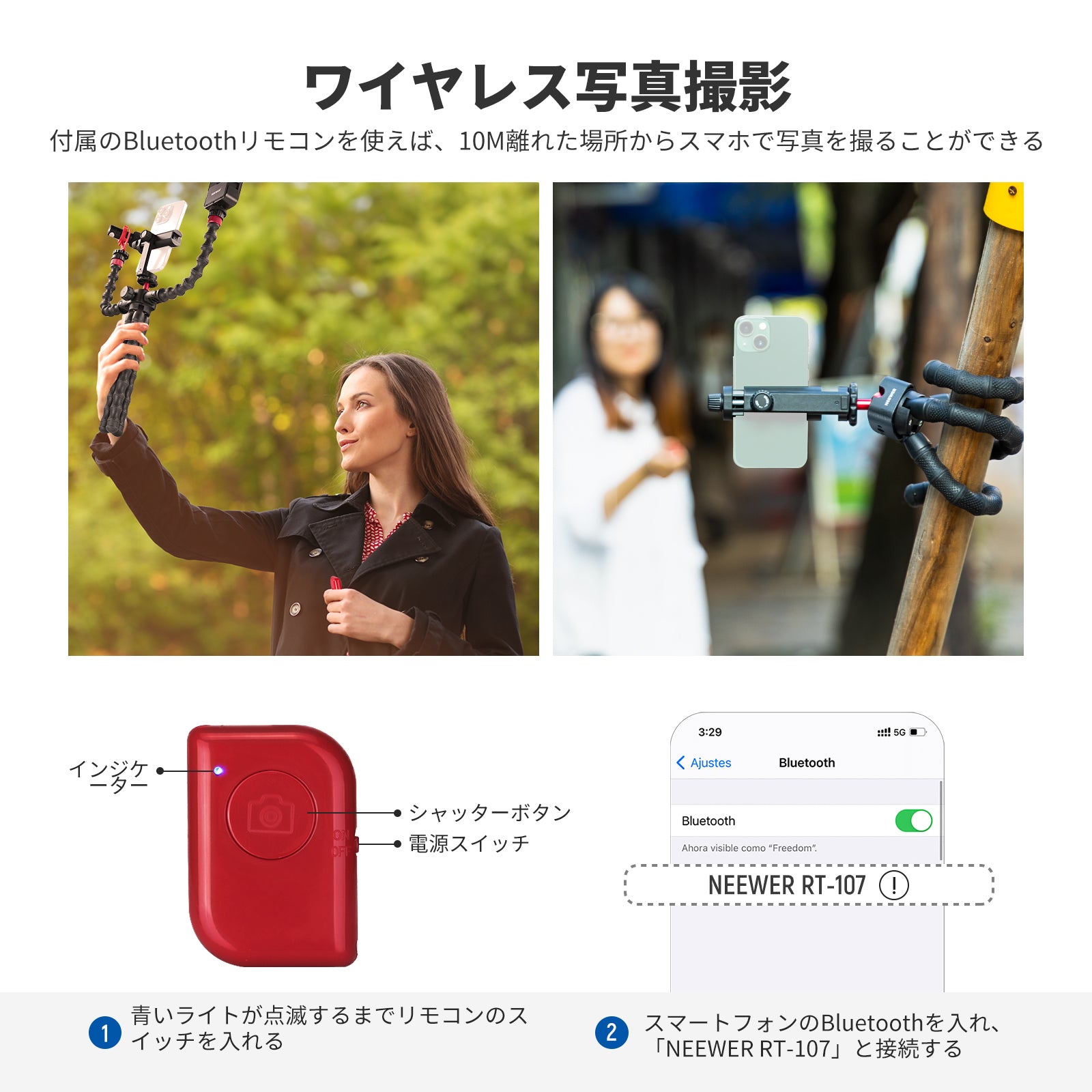 【便利なリモートシャッターレリーズ】シャッターレリーズをBluetooth接続でiOSまたはAndroidモバイルデバイスとペアリングすると、最大10M離れた場所からボタンをタップするだけで自撮り、写真撮影、ビデオ録画ができます。