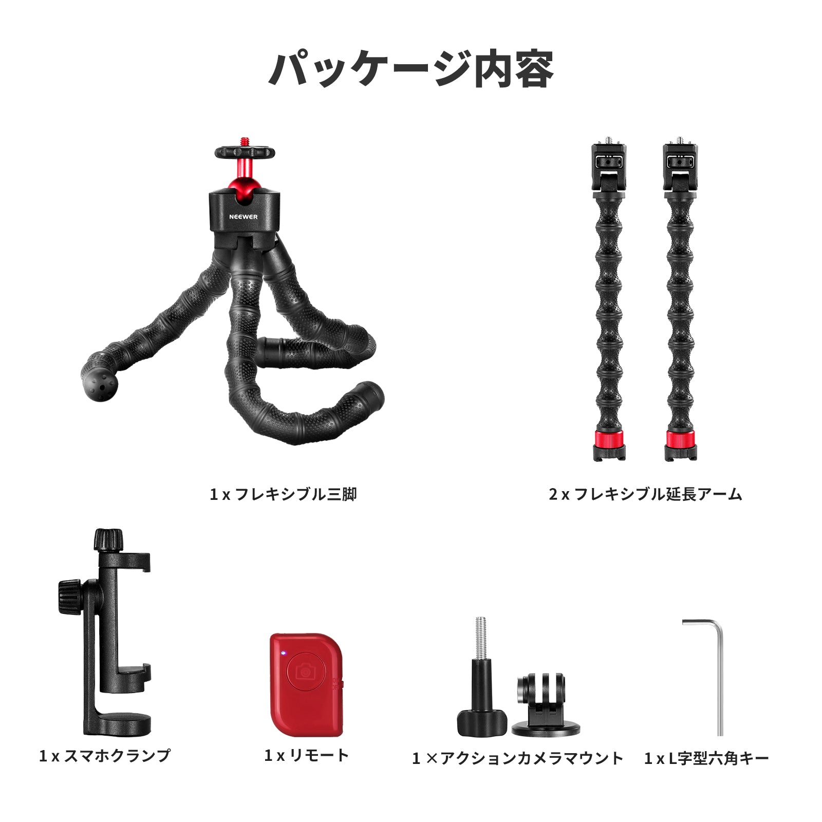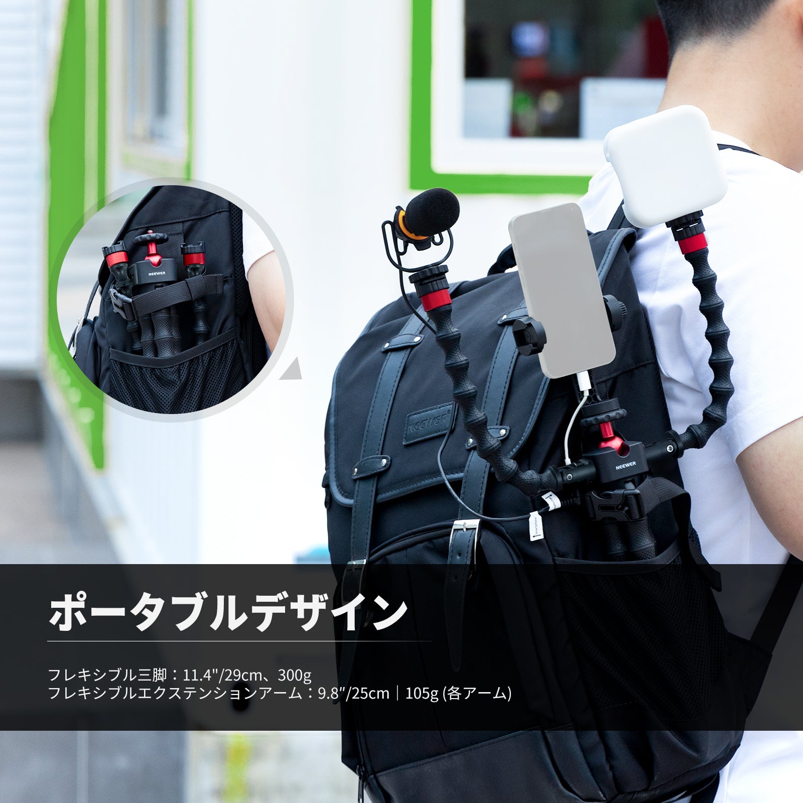 【取り外し可能な2本の延長アーム 】曲げられる2本の延長マジックアームは、位置決めピン付きの1/4インチネジで三脚にしっかりと取り付けられ、上部にはLEDライトやミニマイクなどのアクセサリーを取り付けるためのコールドシューがあり、ライブストリーミング、自撮り、Vloggingの品質を向上させるのに役立ちます。