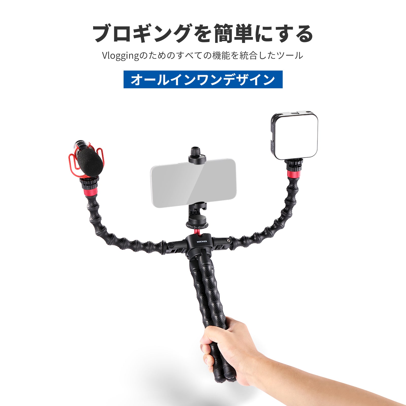 【フレキシブルVlog三脚】 T91フレキシブル三脚は、柔らかく曲げられる脚で、高さや角度を自由に調整したり、木の枝や街灯の柱、手すりに巻き付けたりすることができます。1/4インチネジ付きのボール雲台は、2kgまでのミラーレスカメラやVlogカメラをサポートし、360°の回転と90°のチルトが可能です。また、屋外での撮影では、ハンドグリップや自撮り棒としても使用できます。
