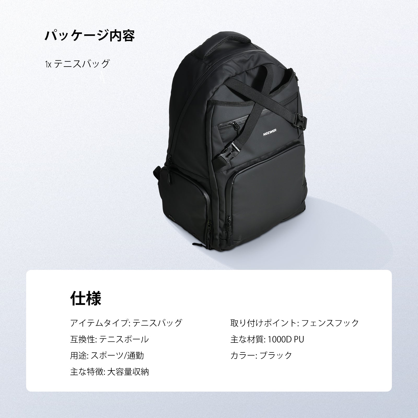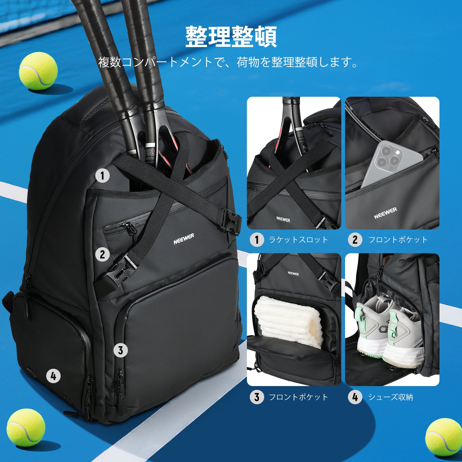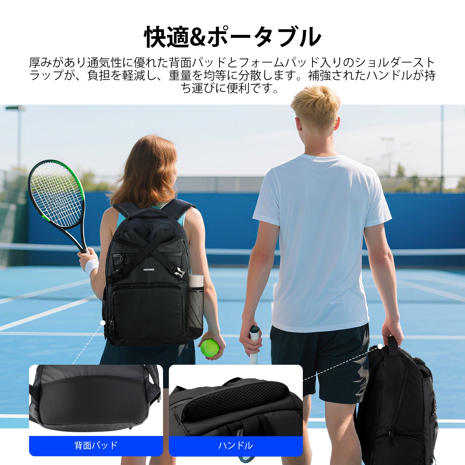 - 【大容量】バックパックはサイズ48x32.5x22cmで、テニスラケット2本、テニスボール数個、サイズ16のシューズまで収納でき、十分な収納力を持ち、様々な身長のユーザーに対応し、男女問わず、最適なテニスギアです。