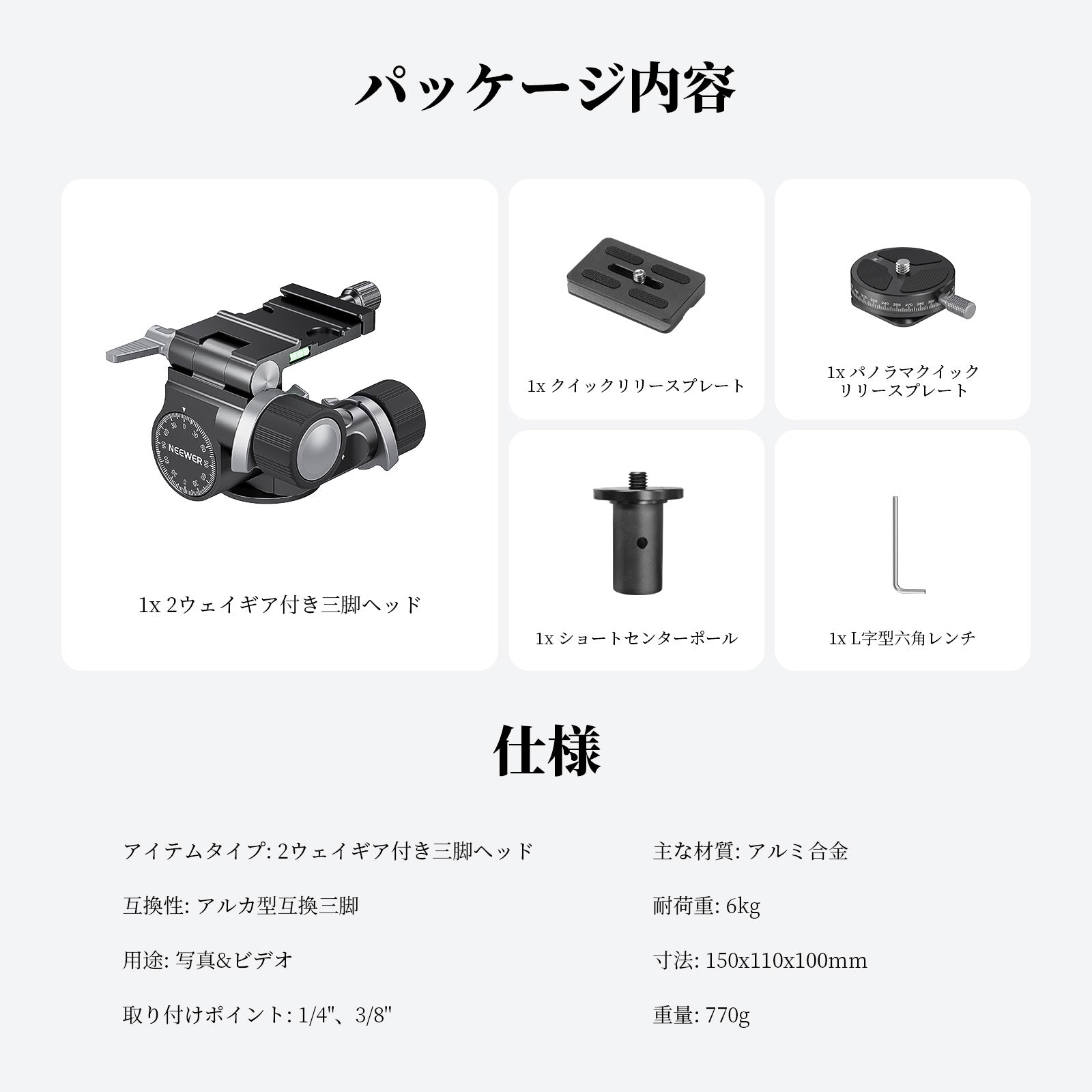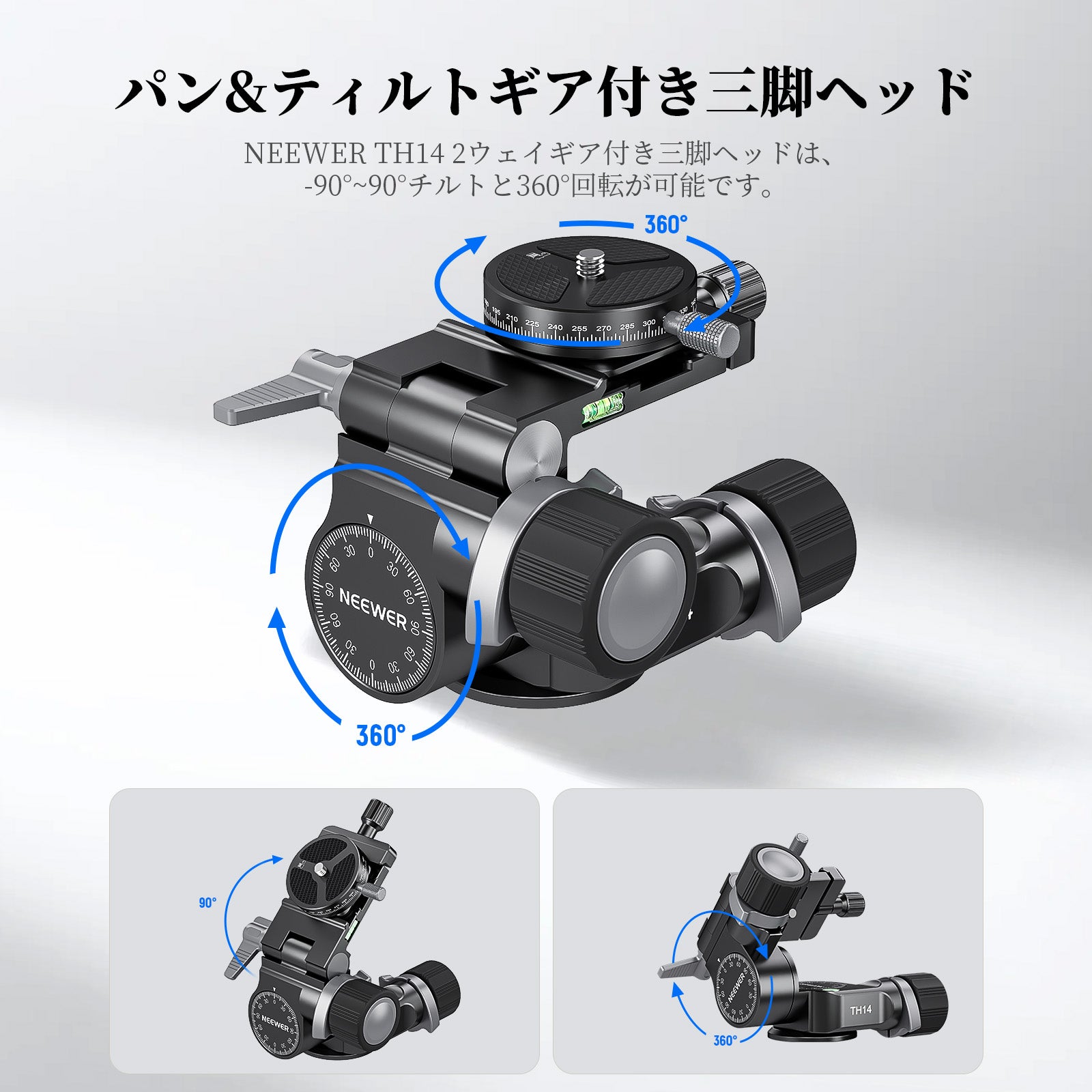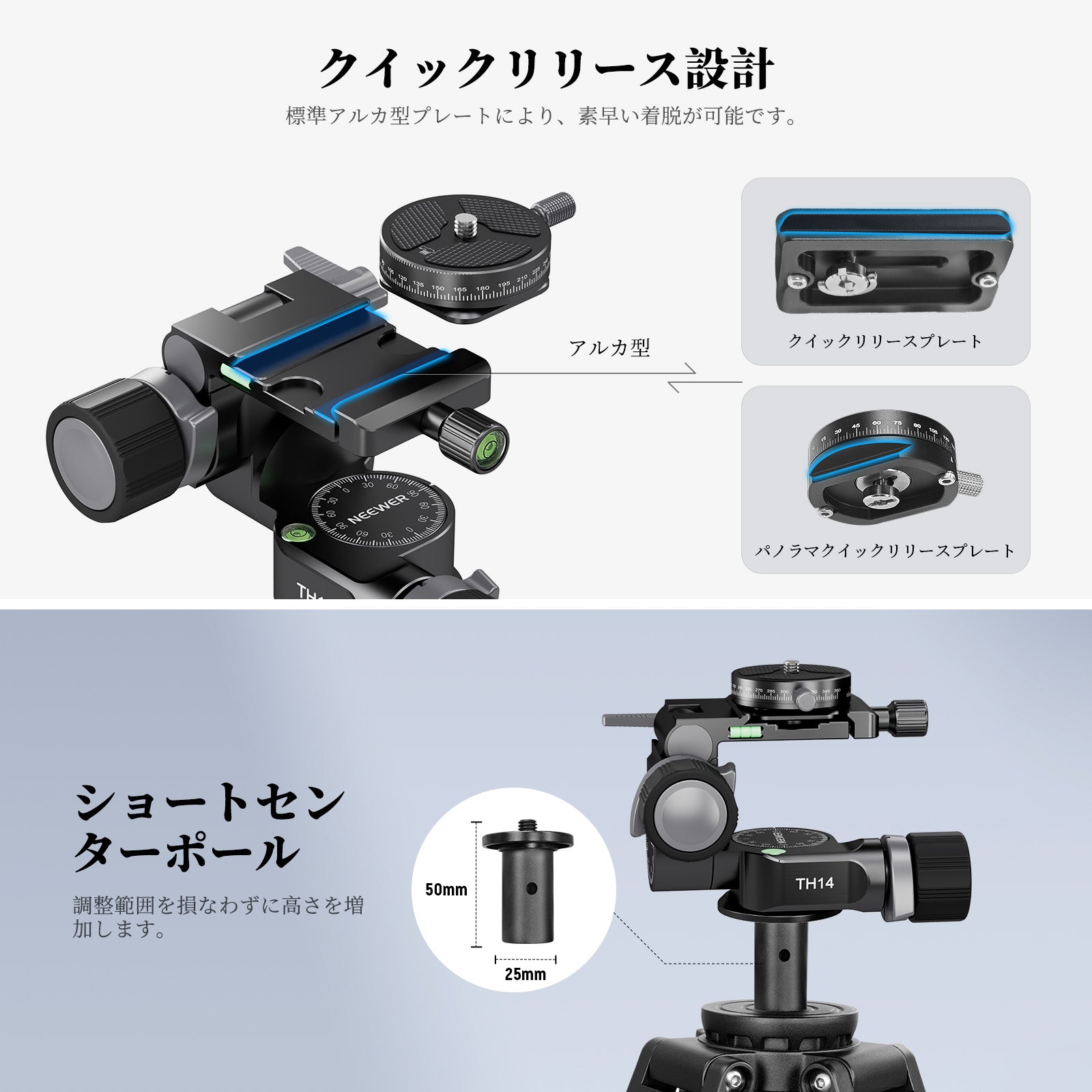 - 【パン&チルトギア付き三脚ヘッド】NEEWER TH14 2ウェイギア付き三脚ヘッドは、-90°から90°までチルトと360°回転が可能で、360°パノラマクイックリリースプレートは、より柔軟なカメラポジションが可能です。ダンピングフリクション制御とカウンターバランスシステムを搭載し、シームレスな調整を実現します。Φ25mmx50mmショートセンターコラムを備え、効率的なリフトを可能にし、予備用クイックリリースプレートも付属しています。
