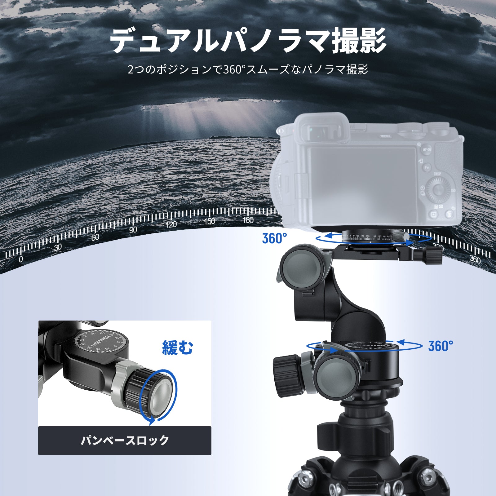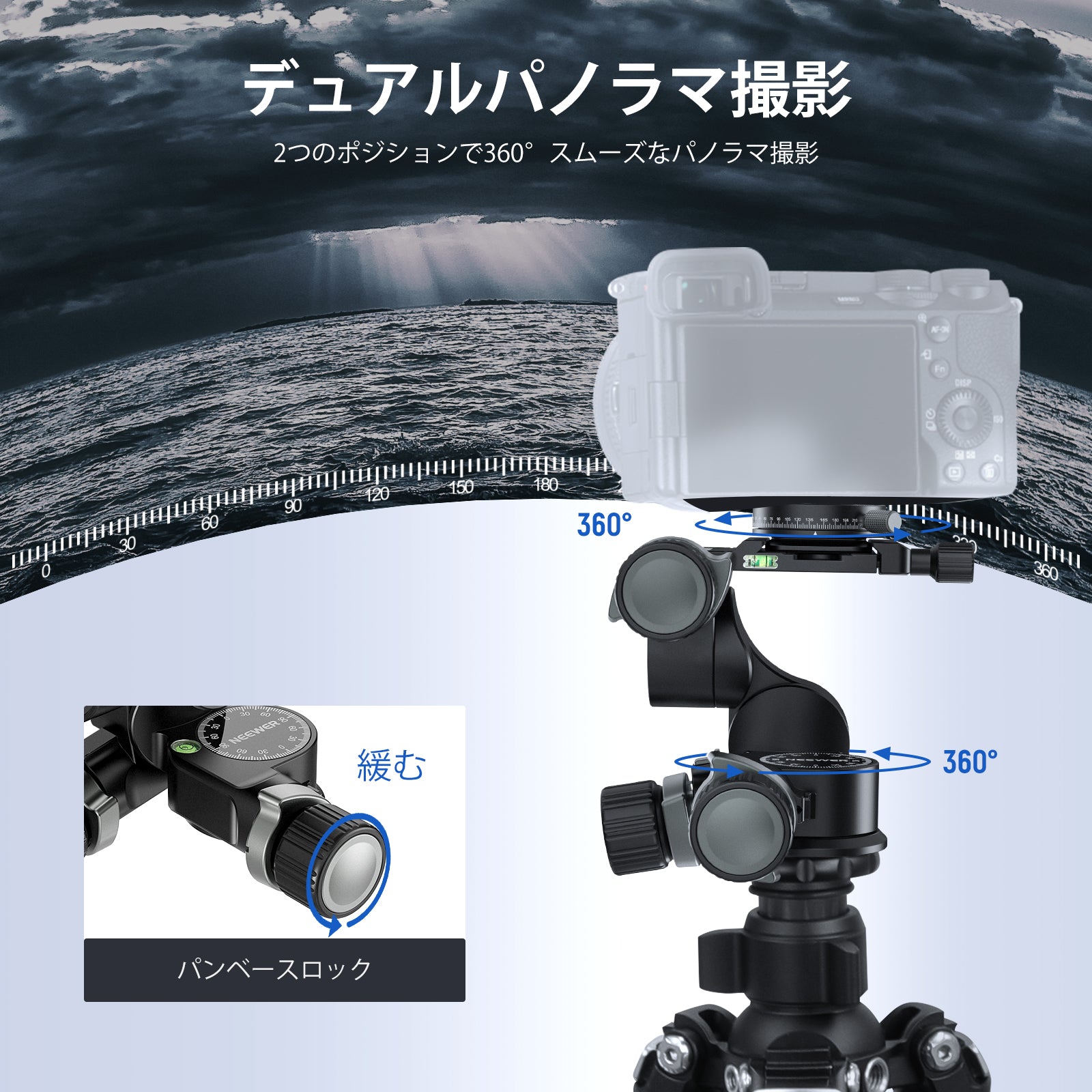 • 【柔軟なカメラアングルを実現】ギア付きヘッドを操作することで、パノラマ撮影、ローアングル撮影、俯瞰撮影、縦位置(ポートレート)または横位置(ランドスケープ)での撮影など、さまざまなカメラアングルを実現できます。マクロ撮影、商品撮影、風景撮影、スタジオワーク、パノラマ撮影、建築測量、ビデオ撮影などに最適です。