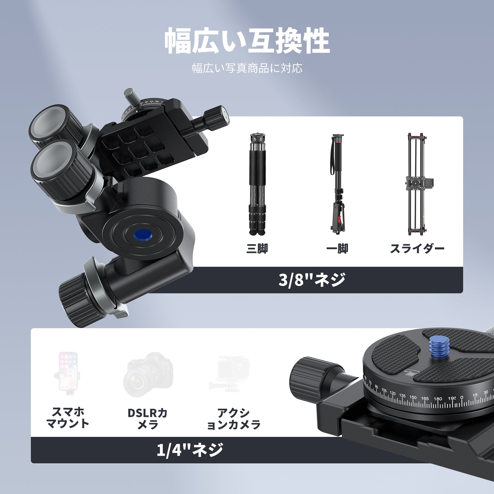• 【1/4"ネジと3/8"三脚ソケット】1/4"ネジは最大6kgまでのDSLRカメラ、ミラーレスカメラ、シネマカメラ、ビデオカメラに取り付け可能で、傷を防ぐラバーパッドが付いています。3/8"三脚ソケットは三脚、一脚、スライダー、カメラカートにヘッドを取り付け、安定した画像やビデオの撮影を可能にします。