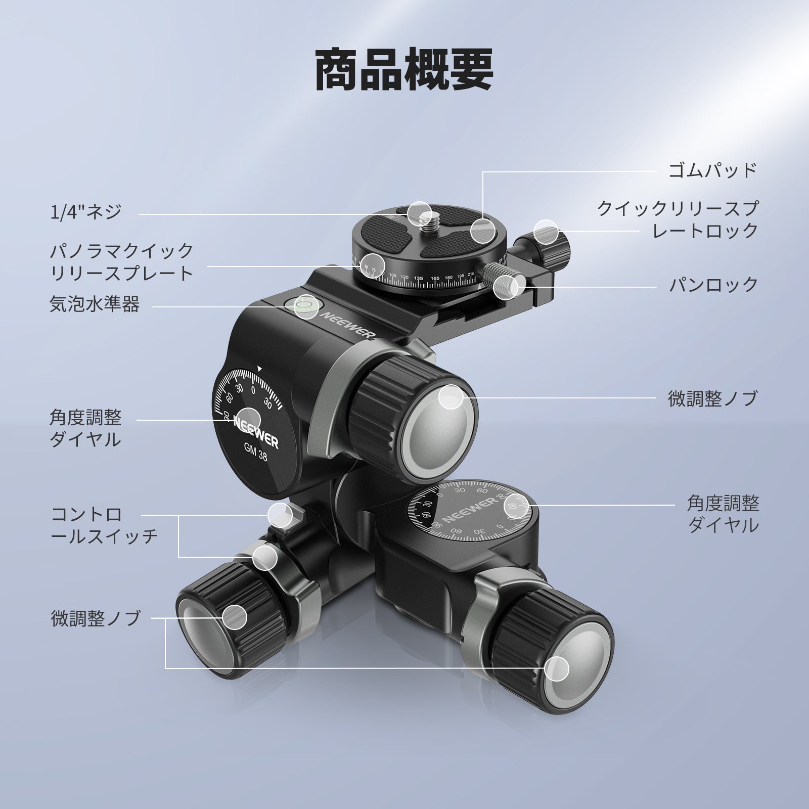 • 【効率的な位置決めを実現する3軸パン&チルト三脚雲台】NEEWER TH15 3ウェイギア付きヘッドは3つの独立したポジションを提供します: -45°~90°正面チルト、-90°~90°側方チルト、360°パンです。減衰フリクションコントロールとカウンターバランスにより、シームレスで快適なカメラの位置決めを実現します。2つの気泡水準器により、正確な水平を保ち、カメラを常にまっすぐな位置に保つことができます。また、Φ25mm×50mmショートセンターポールを装備し、効率的なリフトと撮影の多様性を向上します。