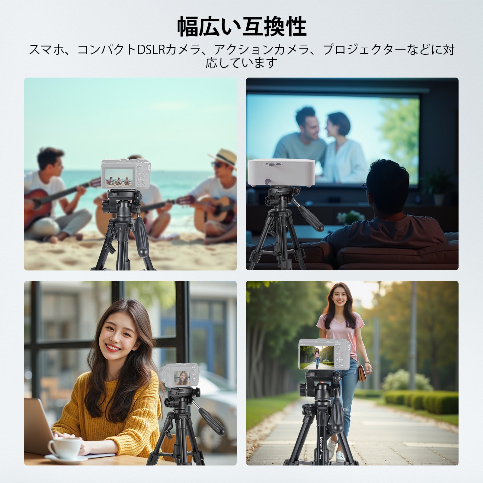 - 【3ウェイパンチルト雲台&ハンドル内蔵】3ウェイパンチルト雲台により、水平構図から垂直構図へのシームレスな移行を簡単に実現できます。内蔵ハンドルと気泡水準器により、素早く簡単に調整でき、720°回転可能な滑り止めゴム足により、どんな地形でも安定します。