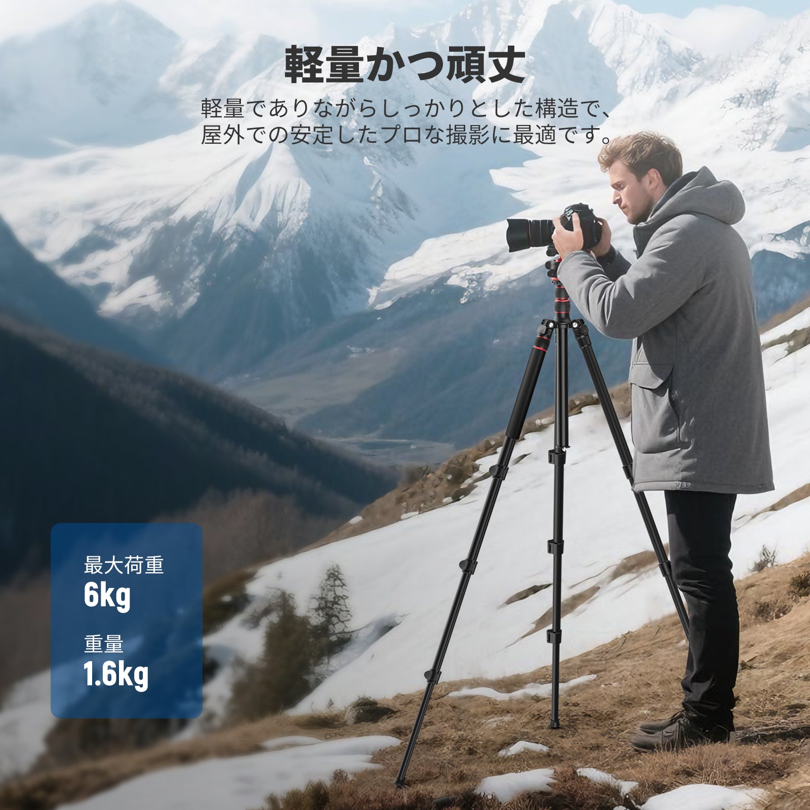 - 【頑丈な金属製】三脚は、頑丈なアルミニウム合金で作られ、最大脚径1"/26mmを誇り、最大6kgのDSLRカメラをサポートします。三脚は滑り止めゴム足と加重フックを備え、特に風の強い条件下で、安定性を高めます。