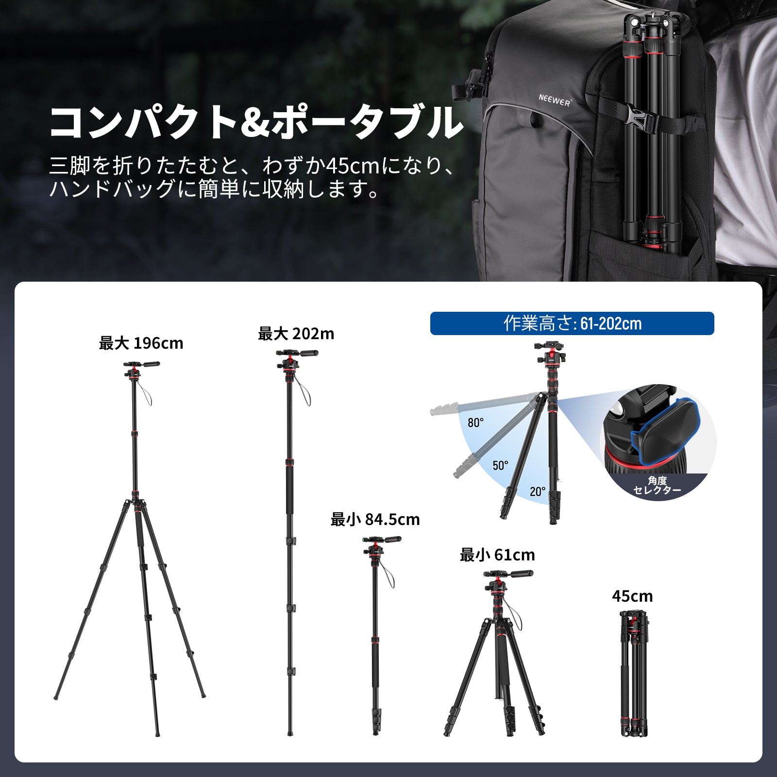 - 【リバーシブル脚&ポータブル使用】ポータブル三脚は重さわずか1.6kgで、リバーシブル脚が、上向きに 180° 折り畳むと直径 4.5"/11.5cmのコンパクトなサイズに折りたため、収納や持ち運びが簡単です。旅行ブログ、自撮り、写真撮影、YouTubeビデオ、屋内外での生放送ラに最適です。