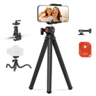 - 【リモコン付き柔軟なスマホ三脚】タコ三脚は従来の三脚とは異なり、支柱、枝、ハンドルバーに柔軟に巻きつき、最大2kgまでのDSLRカメラ、アクションカメラ、スマートフォン、タブレットをしっかりとマウントします。内蔵ハンドルはスマホホルダーにもなり、付属のアクションカメラアダプターを使用すれば、デュアルデバイスでの撮影も可能です。また、Bluetoothシャッターレリーズも付属しており、遠くからでもトリガーが可能です(≤33ft/10m、遮蔽物なし)