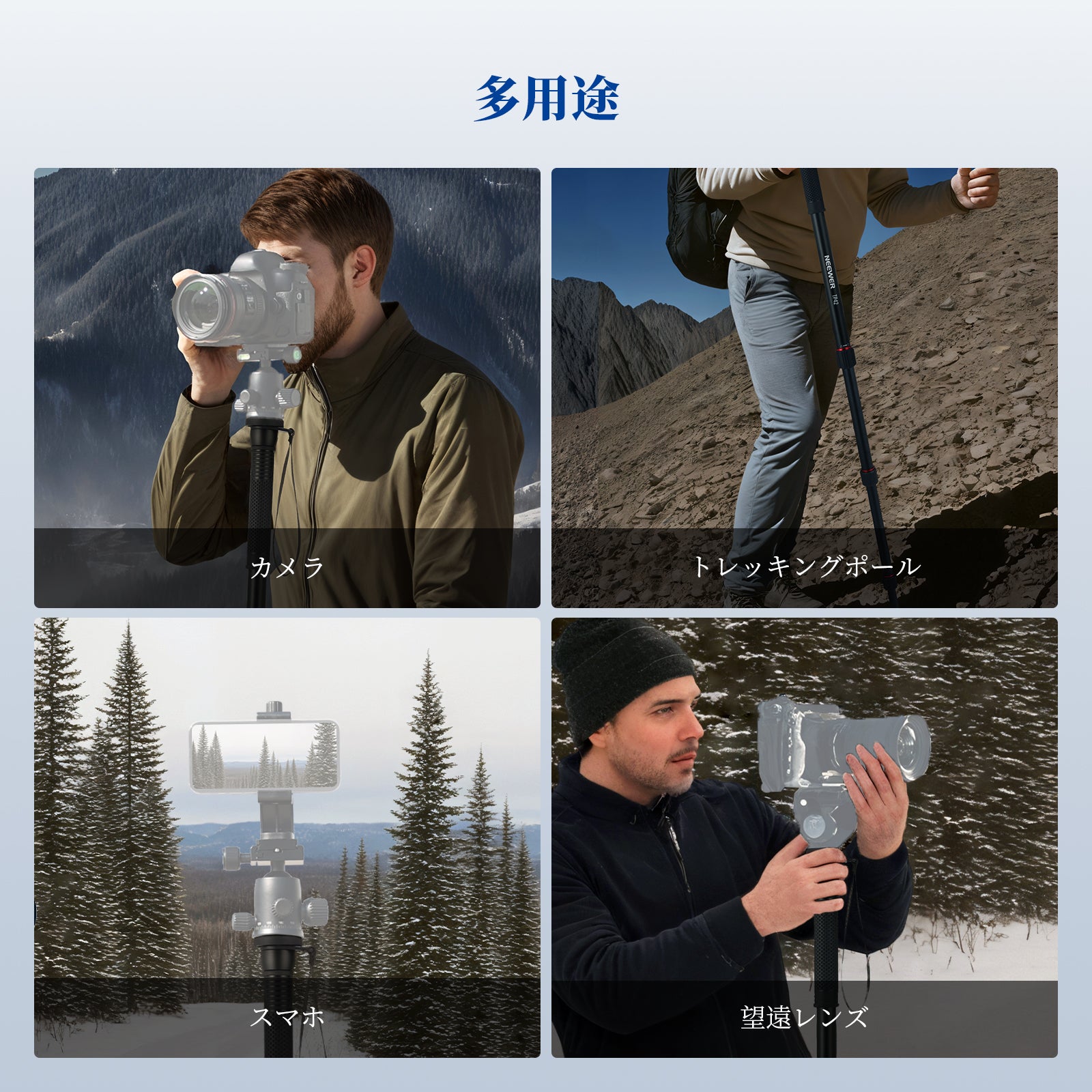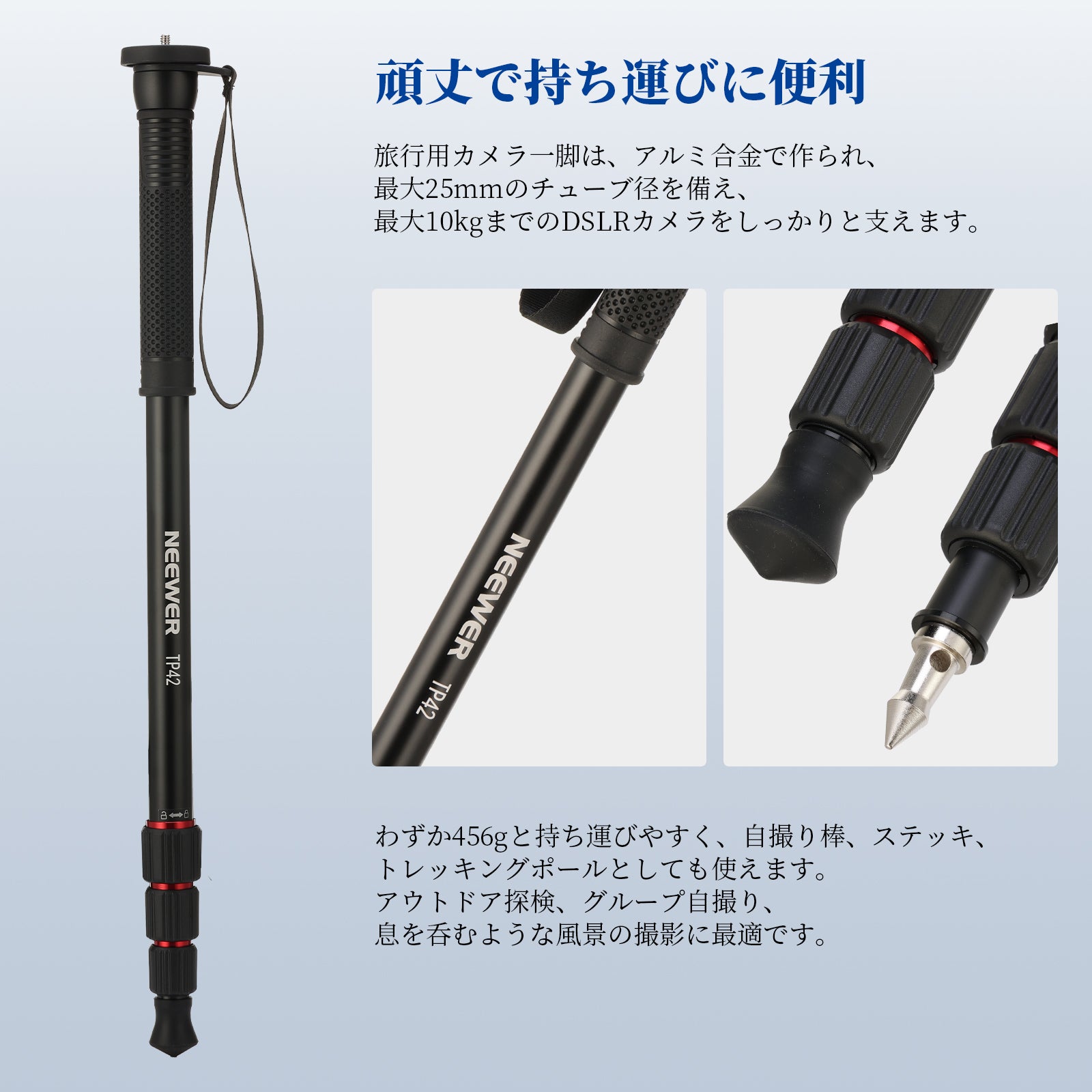 - 【頑丈&ポータブル】旅行用一脚はアルミニウム合金製で、最大チューブ径1"/25mm、10kgまでのDSLRカメラに対応します。重量はわずか456gで、携帯性に優れています。重型三脚(三脚スタンド)とは異なり、自撮り、ウォーキング、ハイキングスティック、トレッキングポールとして使用できます。屋外探検、ヨーロッパ旅行のブログ、ビデオ撮影、友人との自撮り、素晴らしい風景の撮影など、多目的なコンテンツクリエイターの必需品であり、インフルエンサーの必須アイテムです。