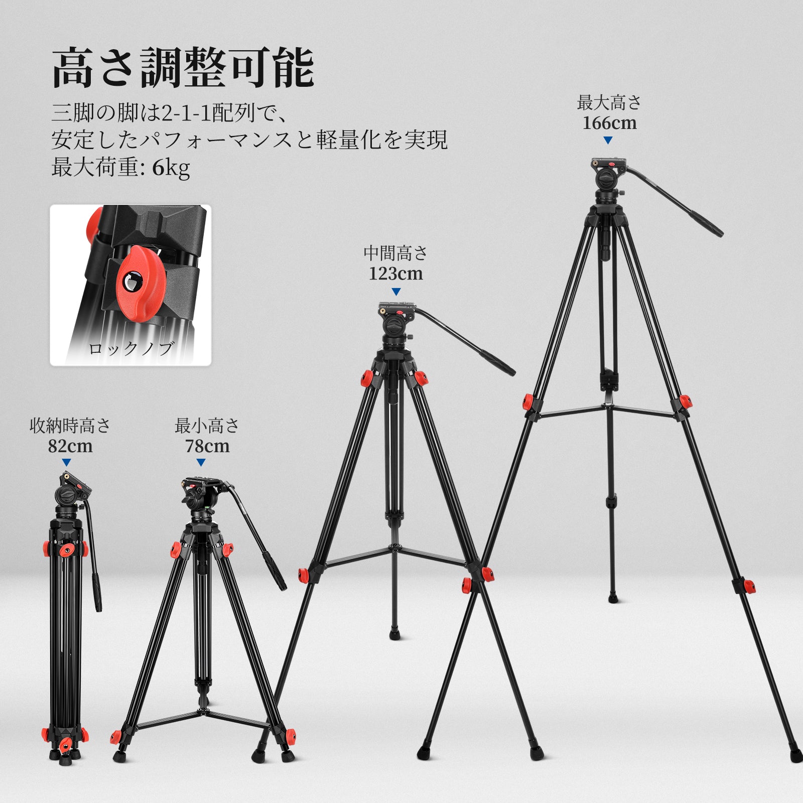 - 【高耐久&軽量】カメラ三脚はアルミ合金で作られ、2-1-1構造とマルチチューブ設計を採用し、最大荷重6kgまでDSLRカメラに対応しながら、重量は2.7kgまで軽量化されています。折りたたみ時の全長は82cmで、屋内外を問わず、商品撮影、スポーツ、結婚式、風景撮影などに最適です。3つ脚ロックノブを回すだけで、77cm、122cm、165cmまで調整可能です。ミッドスプレッドレバーにより、素早く簡単に着脱できます。