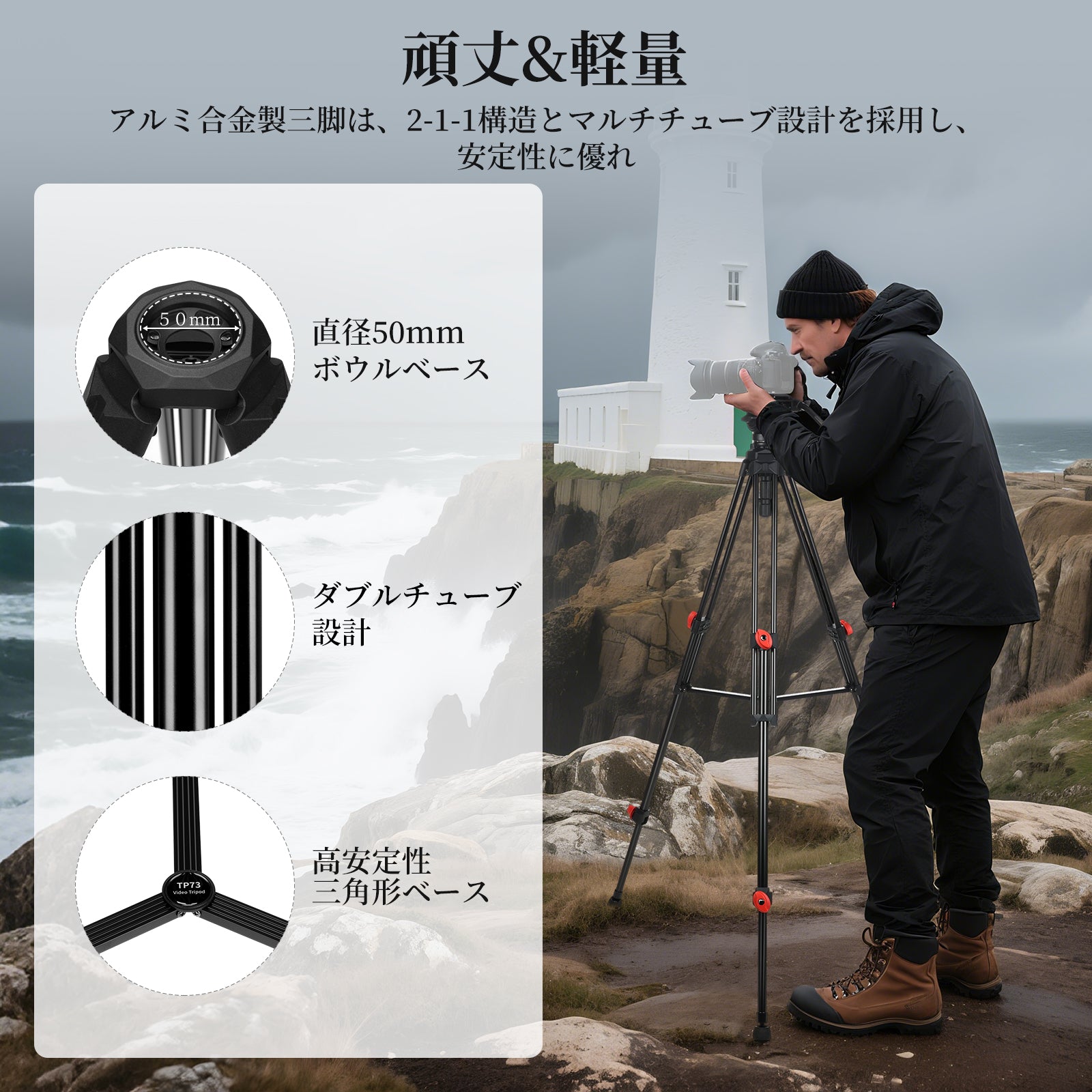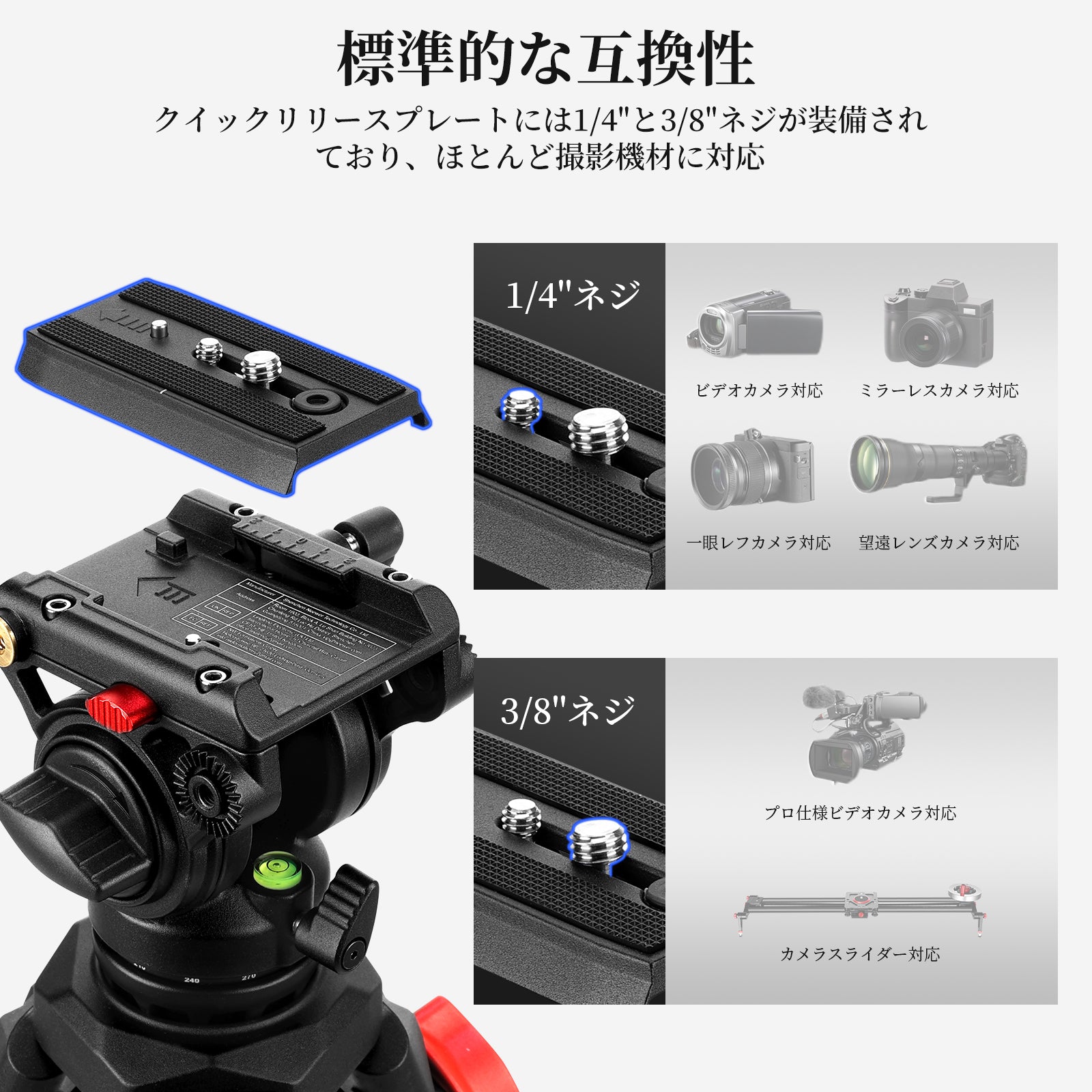 - 【優れたフルードドラッグパンヘッド】ビデオ三脚は、フルードドラッグパンヘッドを搭載し、スムーズな摩擦ダンピングを提供し、360°回転、-75°~+90°チルト範囲に対応しています。取り外し可能なハンドルは、左利き、右利きどちらでも使用できます。 75mmボウルベースには360°スケールが付いており、鮮明なパノラマ画像を撮影できます。水平調整ハンドルと内蔵気泡水準器も付属し、素早く水平調整が可能です。フルードヘッドは取り外し可能で、75mmベース径の他の三脚にも取り付けられます。