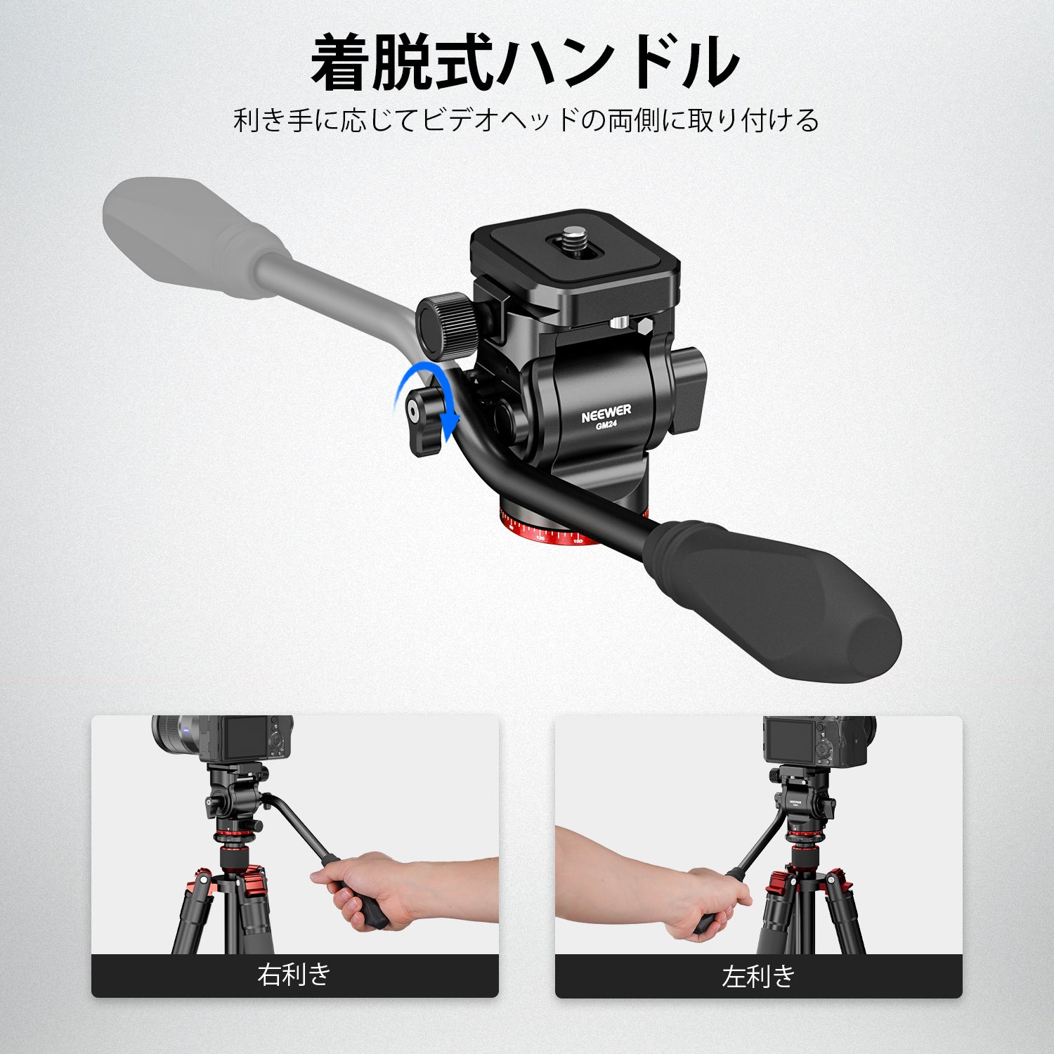 - 【取り外し可能なハンドル】 付属のL型六角レンチで取外し、右手用・左手用のハンドルを取り付けます。 また、流体ヘッドに磁石で取り付けられているため、簡単に取り外すことができます。
