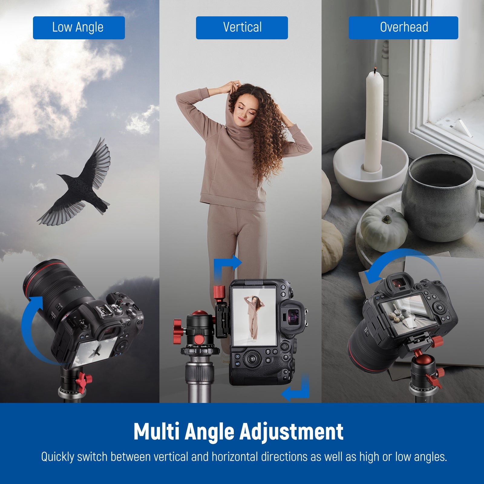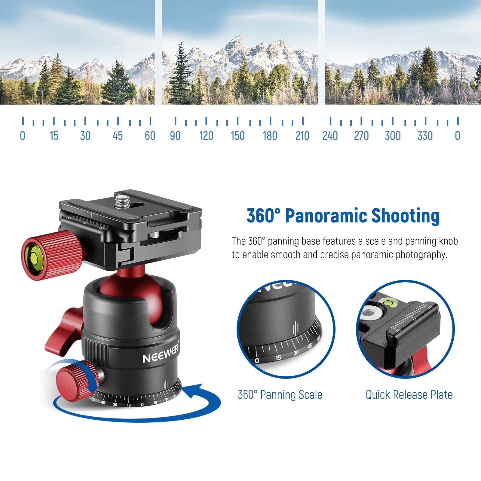 - 【パノラマヘッドによる柔軟な動き】三脚ヘッドは、360°のパンスケールと正確なキャリブレーションおよびパンロック機能を備えており、カメラを三脚に固定しながらパノラマ写真を撮影できます。 スイベルボールヘッドは、垂直、水平、または頭上にかかわらず、各撮影角度に合わせて簡単に傾けることができます。