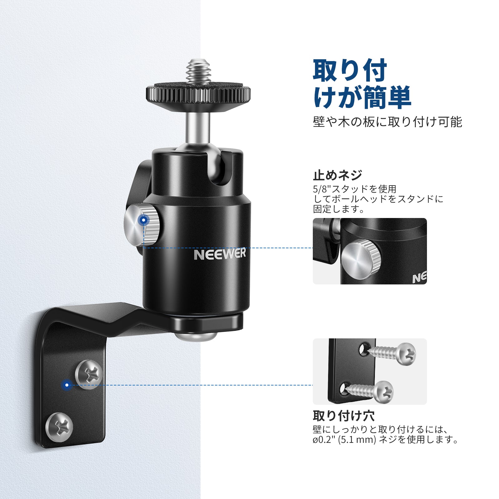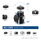 【脱着式ボールヘッド】360°回転と90°傾斜のボールヘッドにより、必要な角度を自由に調整できます。2 本のネジを外して取り外し、内側に隠れている5/8"のスタッドを使用します。