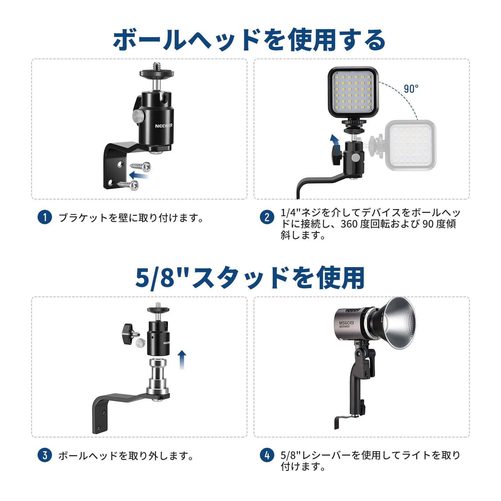 【省スペースで多機能取り付け】NEEWER E字型壁掛けブラケットは、写真、ビデオ撮影スタジオ、ヘアサロン、タトゥー ワークスペースでデバイスを壁や天井に取り付けるように、よりコンパクトで安全な対策を提供します。