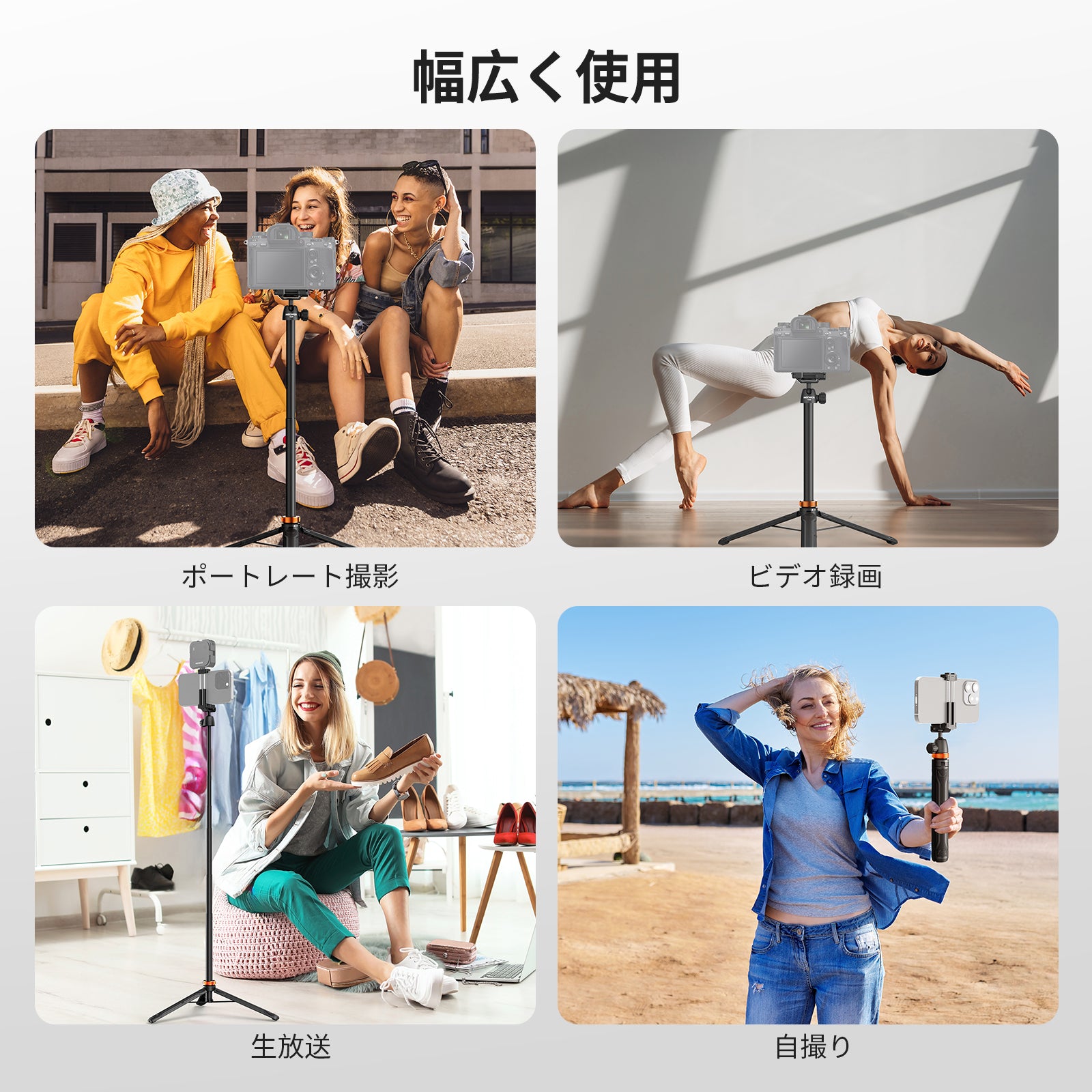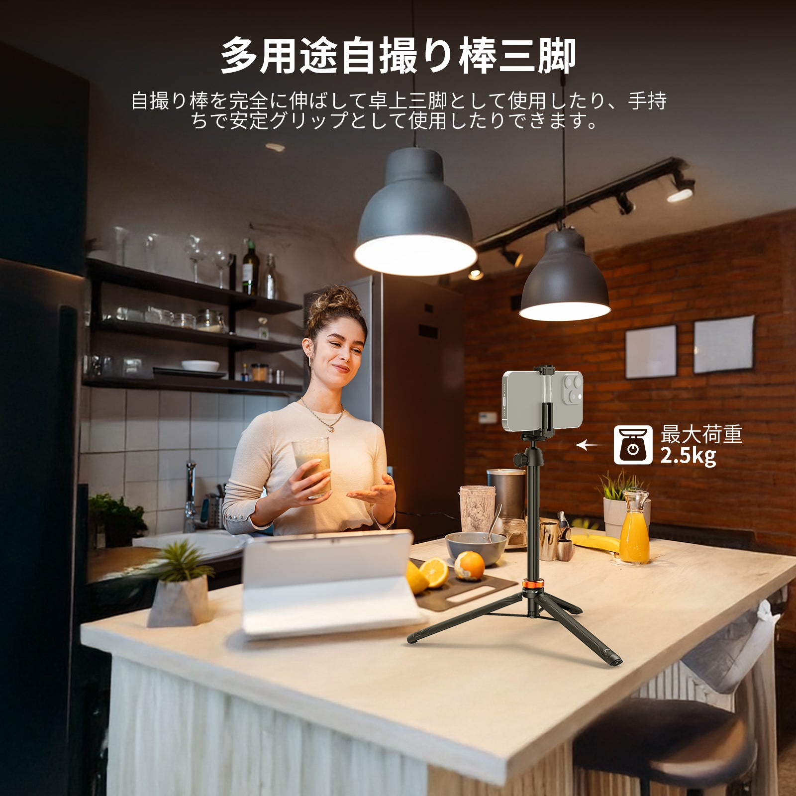 - 【360°ボールヘッド&素早く高さ調整】7段自撮り棒卓上三脚は、ロックリングを回すだけで、34cm-149.5cmの高さを調整できます。さらに、自撮り棒三脚は、Uノッチ付きの金属製ボールヘッドを搭載しており、360°回転と90°垂直撮影が可能で、縦向きと横向きのモードを素早く切り替えます。