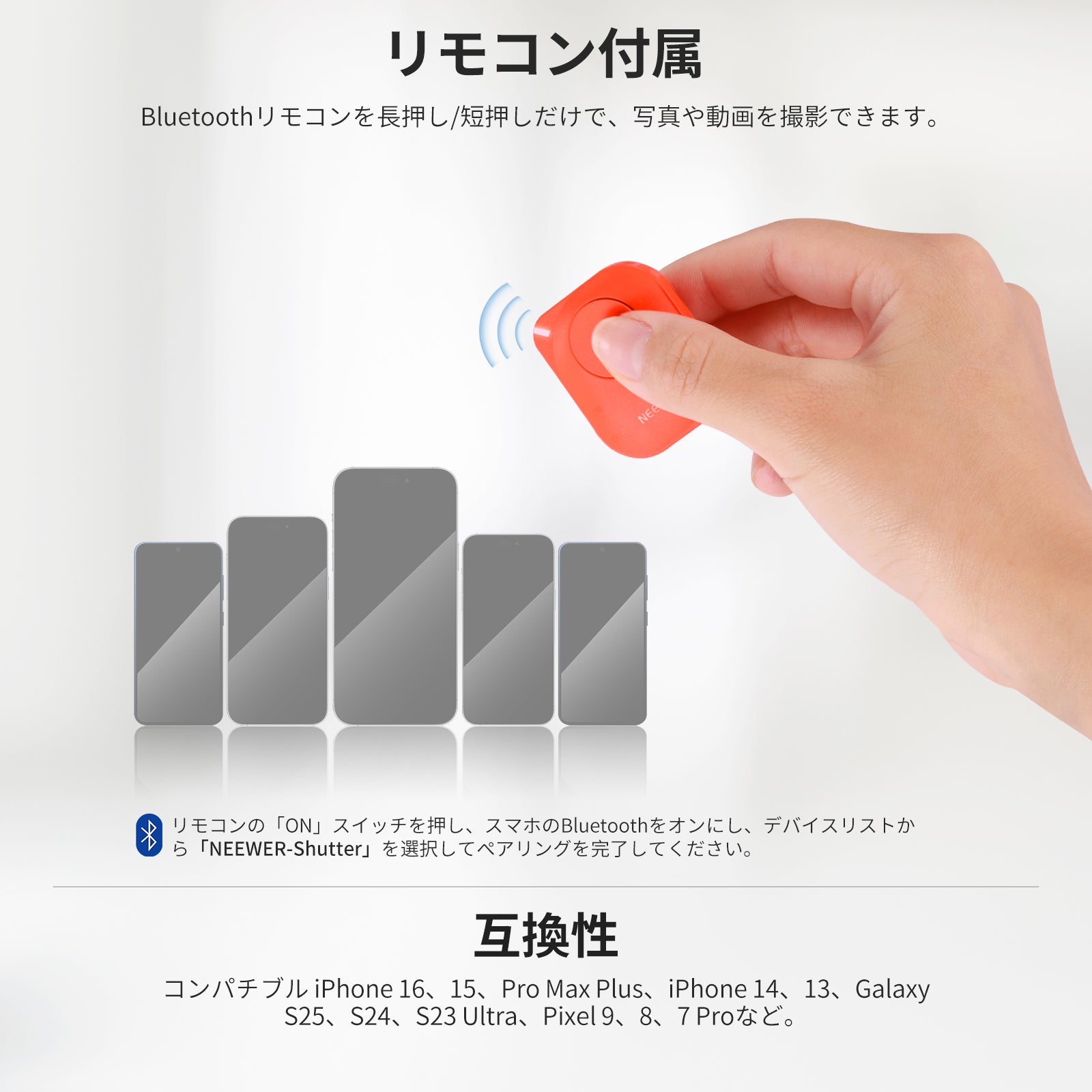 主な特徴: 2 in 1 スマホクリップ、リモコン