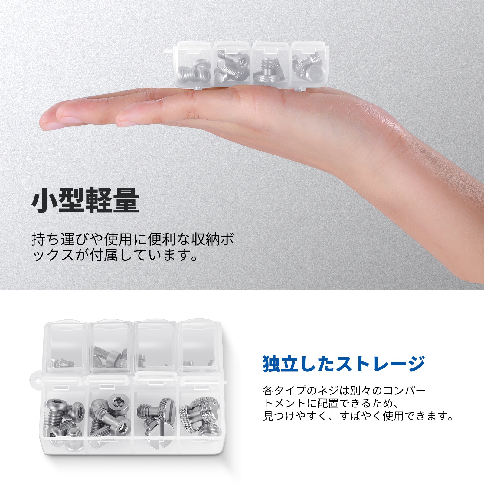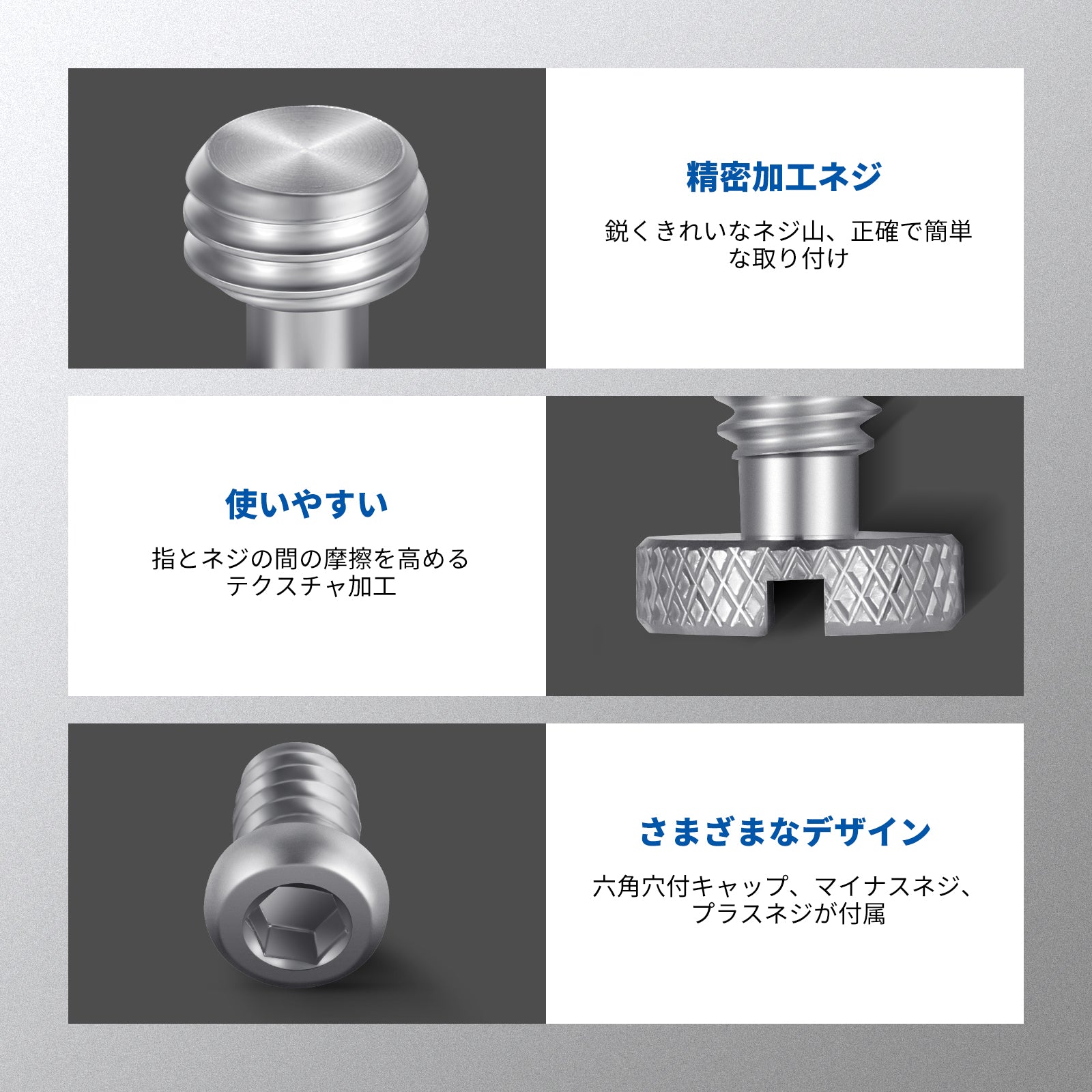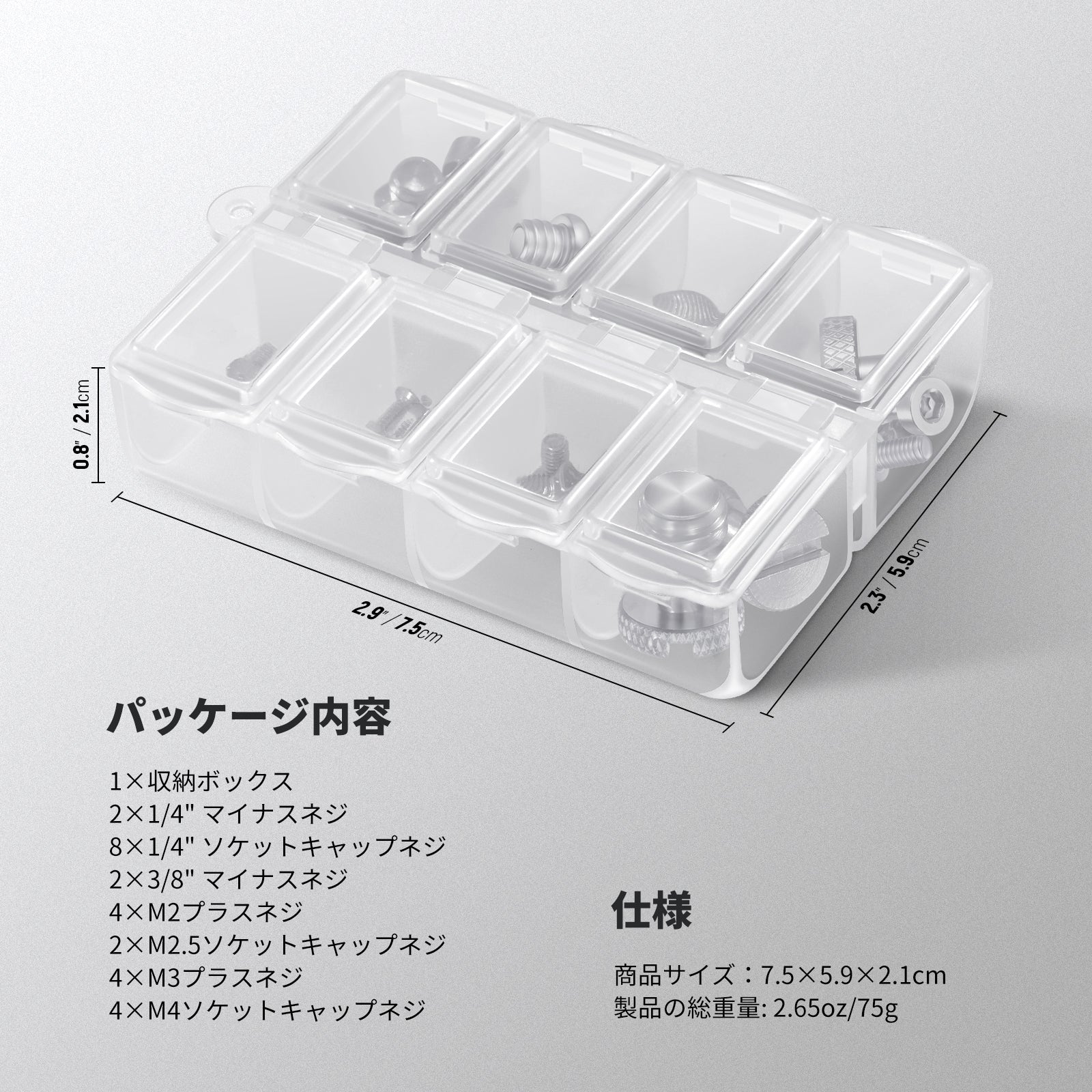 【便利な撮影用ネジセット】ネジなどの小さなカメラアクセサリは常に置き忘れてしまうので、このカメラマウントネジセットを入手して、予備のネジを常に手元に用意しておきます。1/4"、3/8"、M2、M2.5、M3、M4の6種類のネジが付属しています。