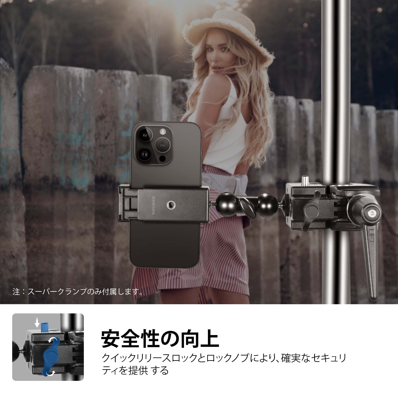 【より大きく、より強く】スーパークランプは黒色陽極酸化アルミニウム合金製で耐久性に優れ、重さ637g、最大15kgの機材を支えることができます。カメラや照明、その他の撮影機材の取り付けに最適です。