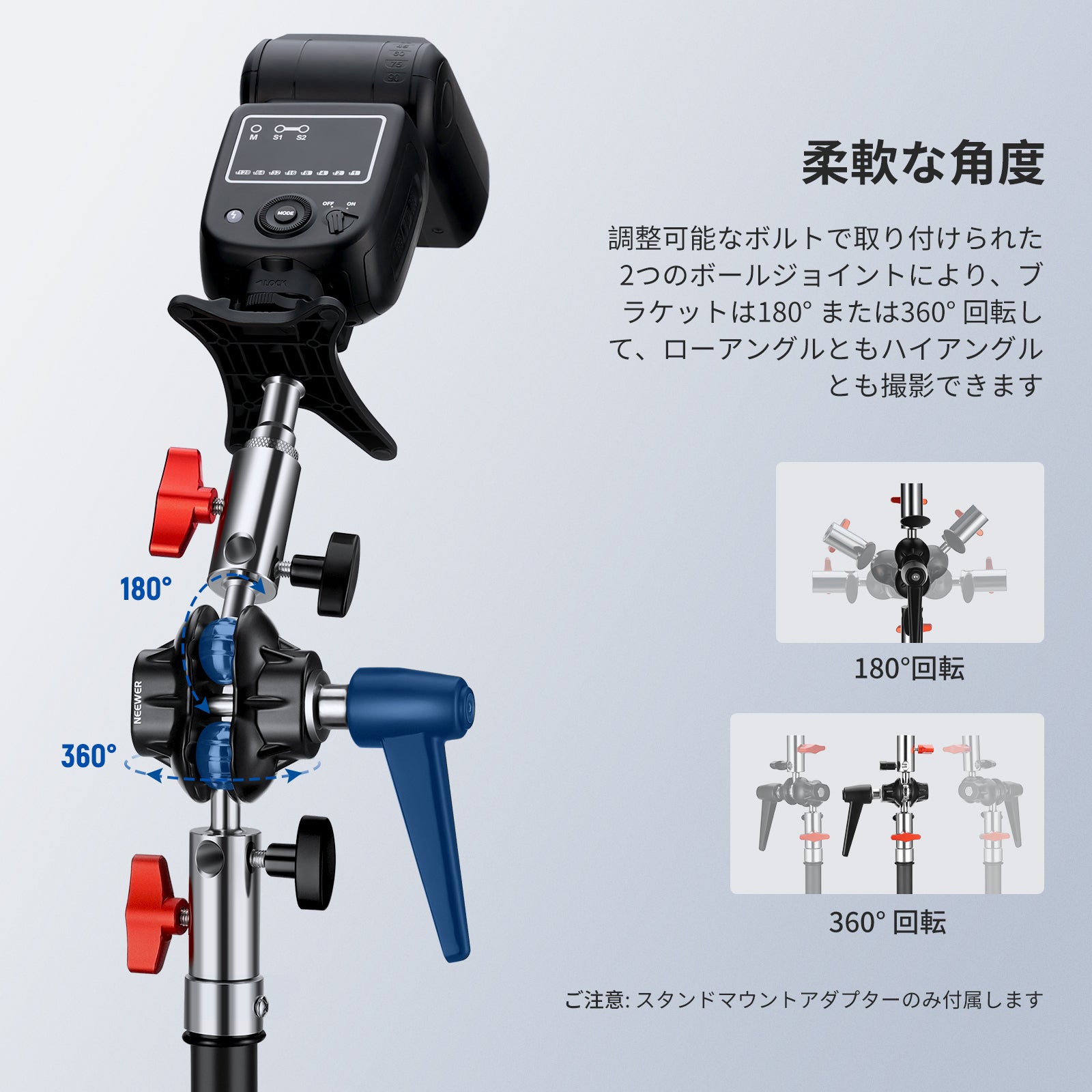 【デュアルボールジョイント&柔軟な位置決め】調整可能なボルトで取り付けられた2つのボールジョイントにより、ブラケットは180°回転し、フラッシュやその他の撮影デバイスをさまざまな角度に配置でき、ローアングルとハイアングル撮影を実現します。人間工学に基づいた金属レバーにより、モニターやスタジオライトが設置されている場合でも、最適な角度を実現し、マウントアダプターを所定の位置にロックできます。