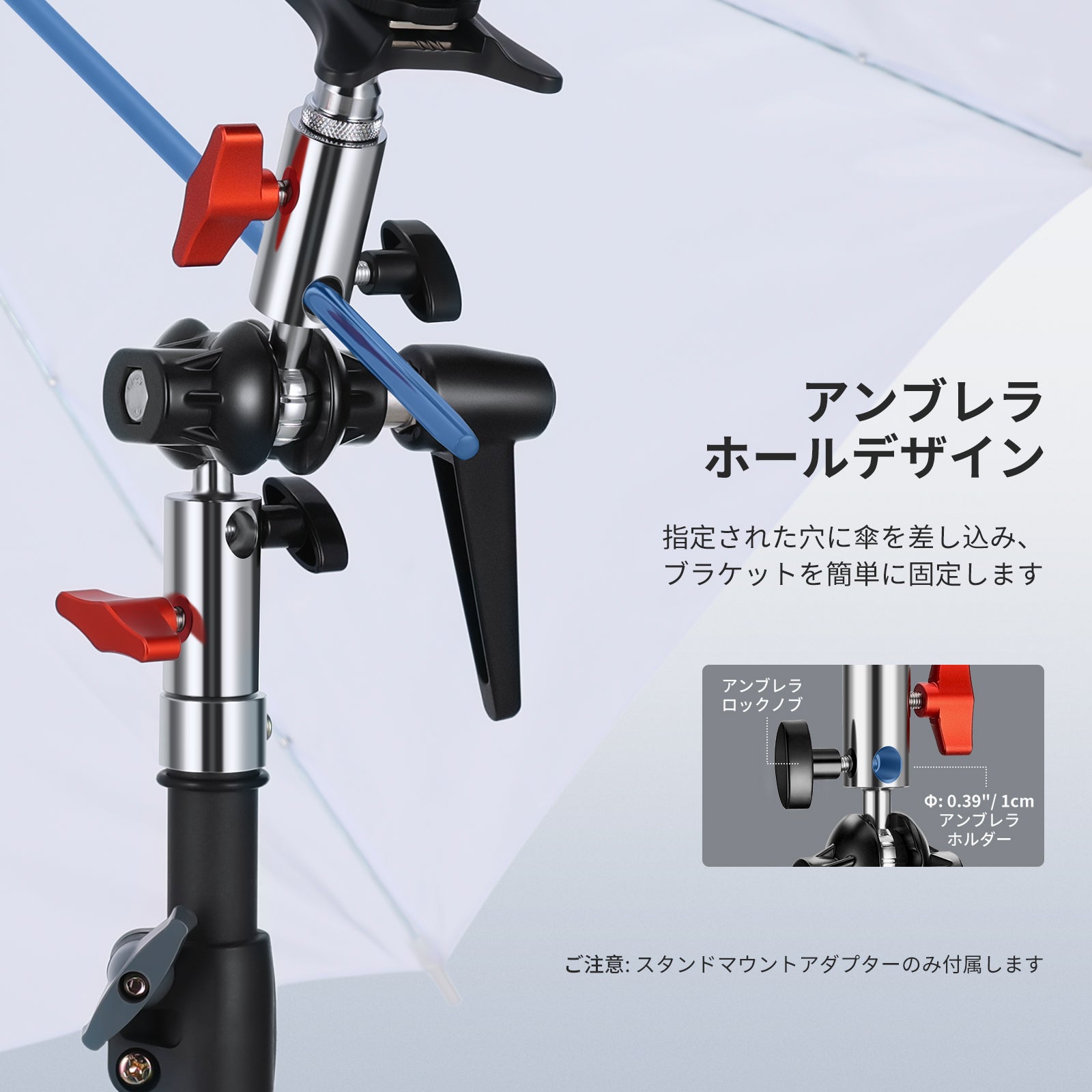 【1cmソフト傘ホルダー2本】指定された穴に傘を差し込み、ブラケットに簡単に固定します。傘とストロボを併用すると、フラッシュの光が柔らかく広がり、角度も調整可能です。