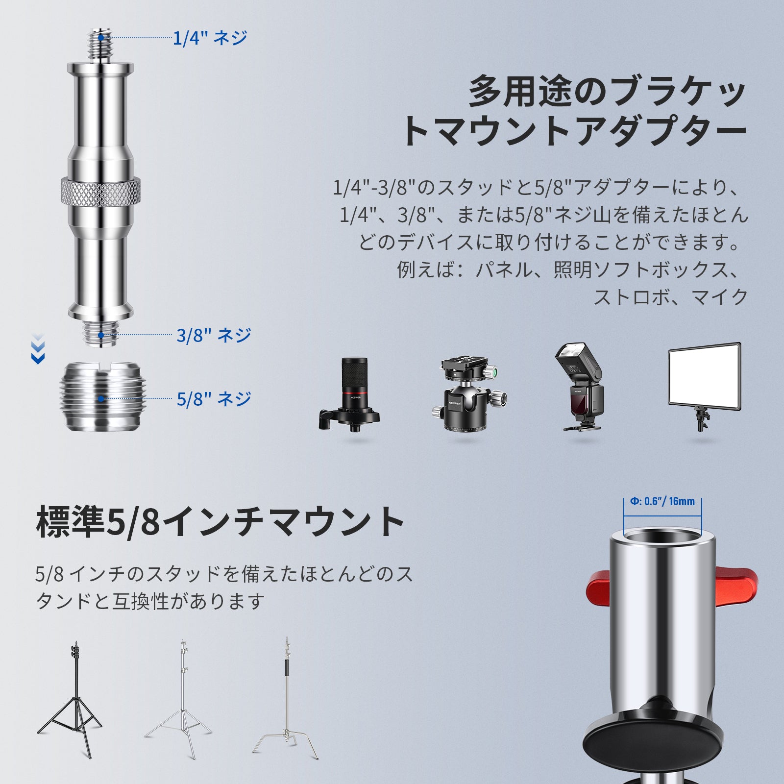 【複数の取り付けネジが利用可能】1/4"~3/8"のオスネジを備えた精密に作られたスピゴットスタッドコンバータは5/8"レシーバーに固定できます。リングライト、スピードライトフラッシュ、ストロボライト、LEDビデオライト、ソフトボックス、マイクなどの取り付けるに適合です。より多くのデバイスを拡張設置できるように、追加の3/8"~5/8"のネジアダプターが付属しています。