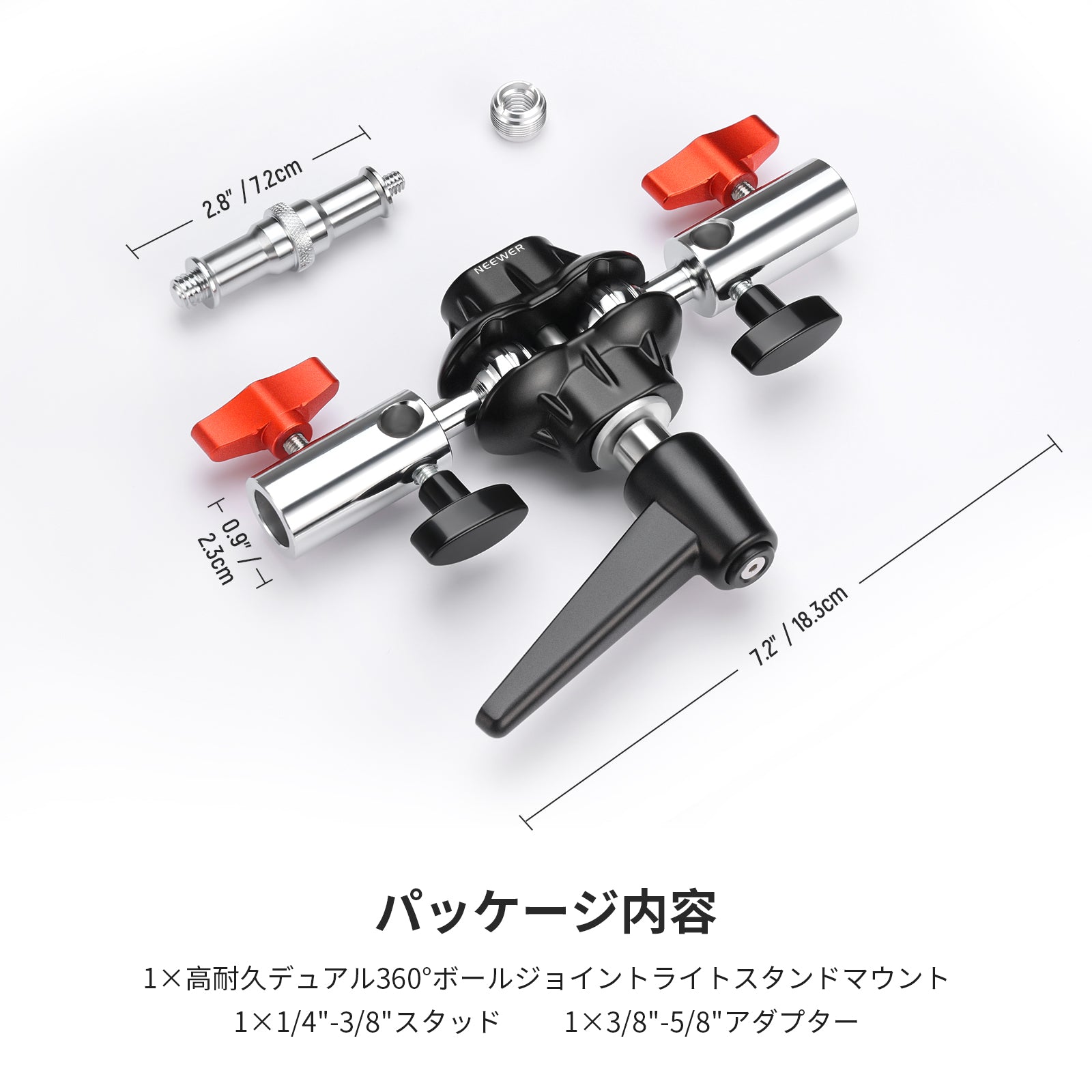 【調整可能なデュアルメス5/8"スタッドレシーバー】便利な手締め蝶ネジノブで固定されたスタンドマウントアダプターは、ほとんどのライトスタンド、Cスタンド、5/8"のスタッドまたはピンを備えたアクセサリーにしっかりと取り付けることができます。ご注意: ライトスタンドは付属しません。