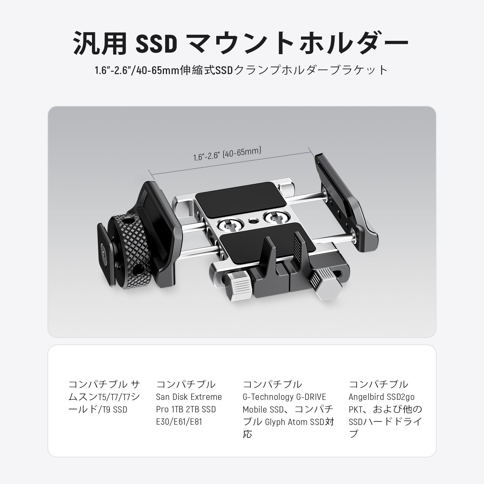 - 【汎用SSDマウントホルダー】1.6"-2.6"/40-65mm伸縮可能なSSDクランプホルダーブラケットはコンパチブル T5/T7/T7 Shield/T9 SSD、コンパチブル San Disk Extreme Pro 1TB 2TB SSD E30/E61/E81、コンパチブル G-Technology G-DRIVE Mobile SSD、コンパチブル Glyph Atom SSD、コンパチブル Angelbird SSD2go PKTなど他のSSDハードドライブ。