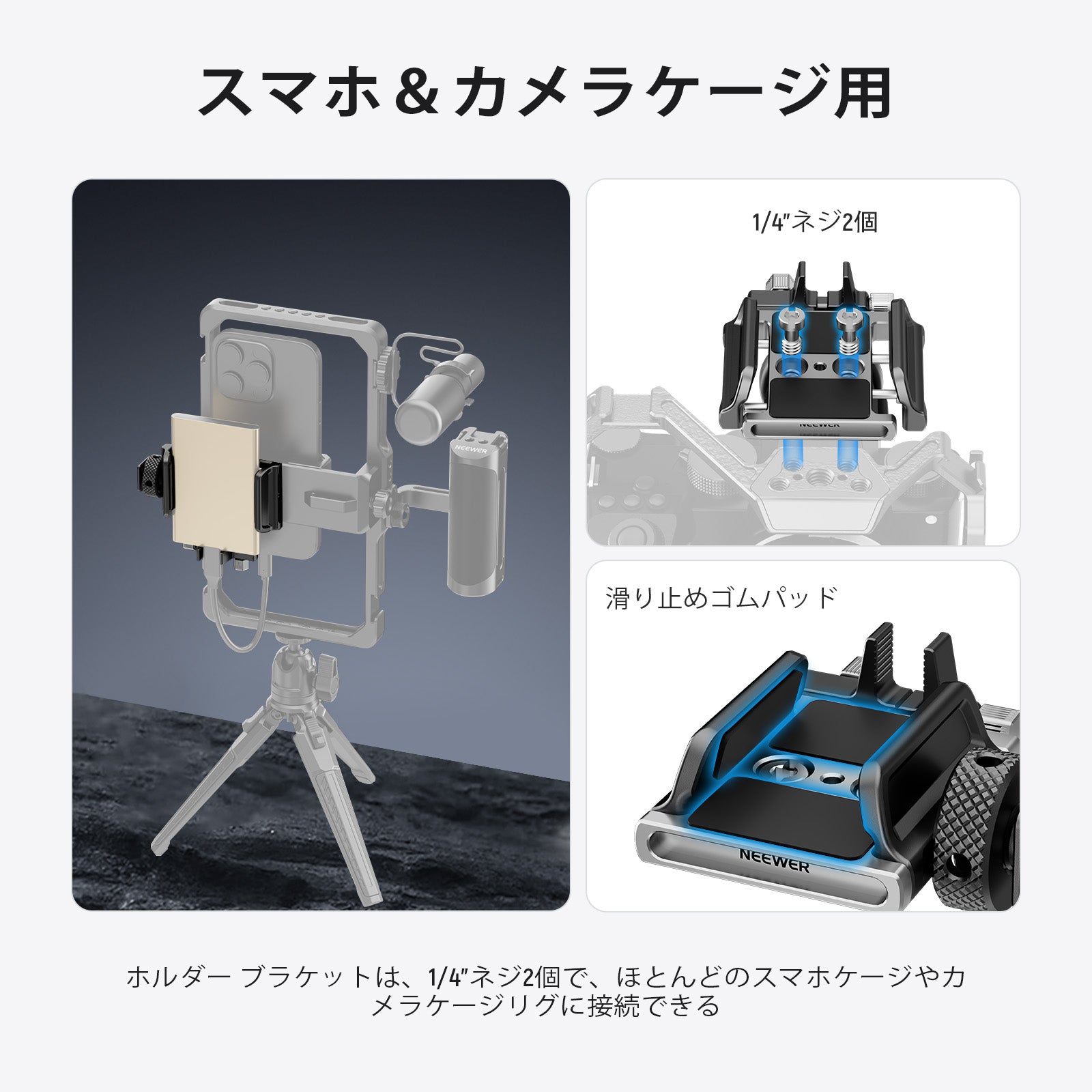 - 【スマホ&カメラケージ用】ホルダーは1/4"ネジ2本が付属し、16 15 Pro/16 15 Pro Max用NEEWER PA043/PA044スマホケージ、S24 Ultra用PA042スマホスタビライザー、Lumix GH5/GH5S用CA056カメラケージなど、ほとんどのスマホケージやカメラケージリグに接続できます。コンパチブル BMPCC 4K 6K用スモールリグカメラケージ。
