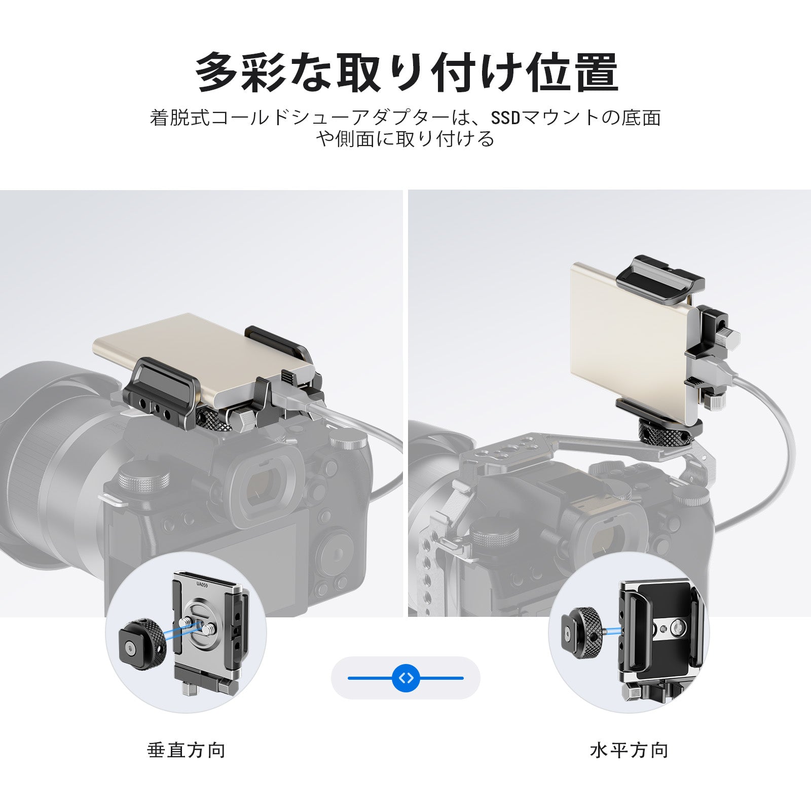 - 【多様な取り付け位置】取り外し可能なコールドシューアダプターはSSDマウントの底面や側面に取り付け、カメラケージ、トップハンドル、スマホ三脚マウントにSSDマウントを垂直や水平に取り付けます。