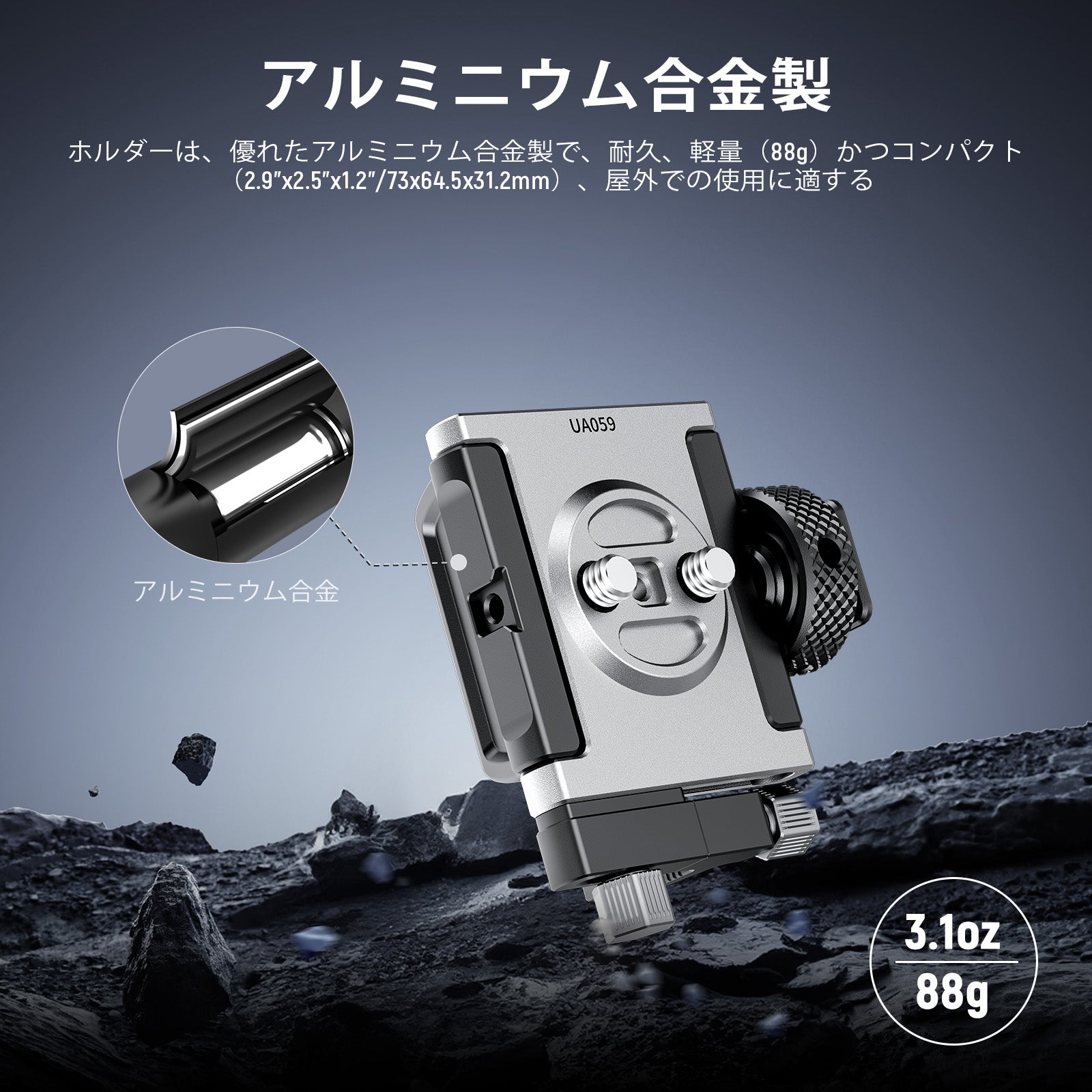 - 【アルミ合金製】ホルダーは優れたアルミニウム合金製で、耐久、頑丈、軽量(88g)とコンパクト(2.9"x2.5"x1.2"/73x64.5x31.2mm)で、屋外でも使用できます。内側のソフトなゴムパッドが衝撃を吸収し、傷から守ります。
