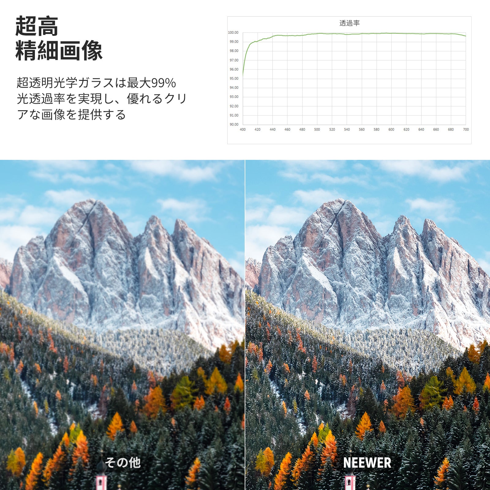 • 【99%高透過率&0.1%超低反射率】カメラレンズUVフィルターはプレミアム超クリア光学ガラスを採用し、最大99%光透過率と0.1%低反射率を実現し、撮影のコントラストとシャープネスを向上させます。