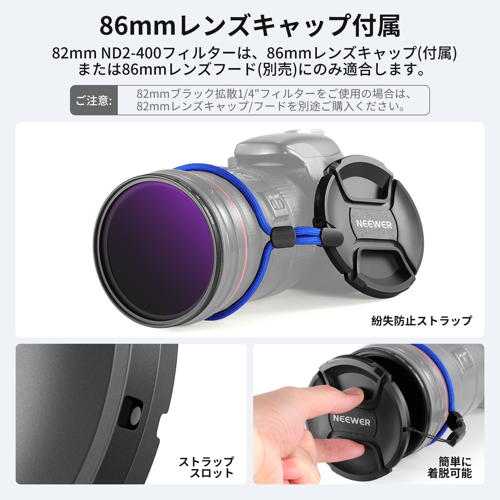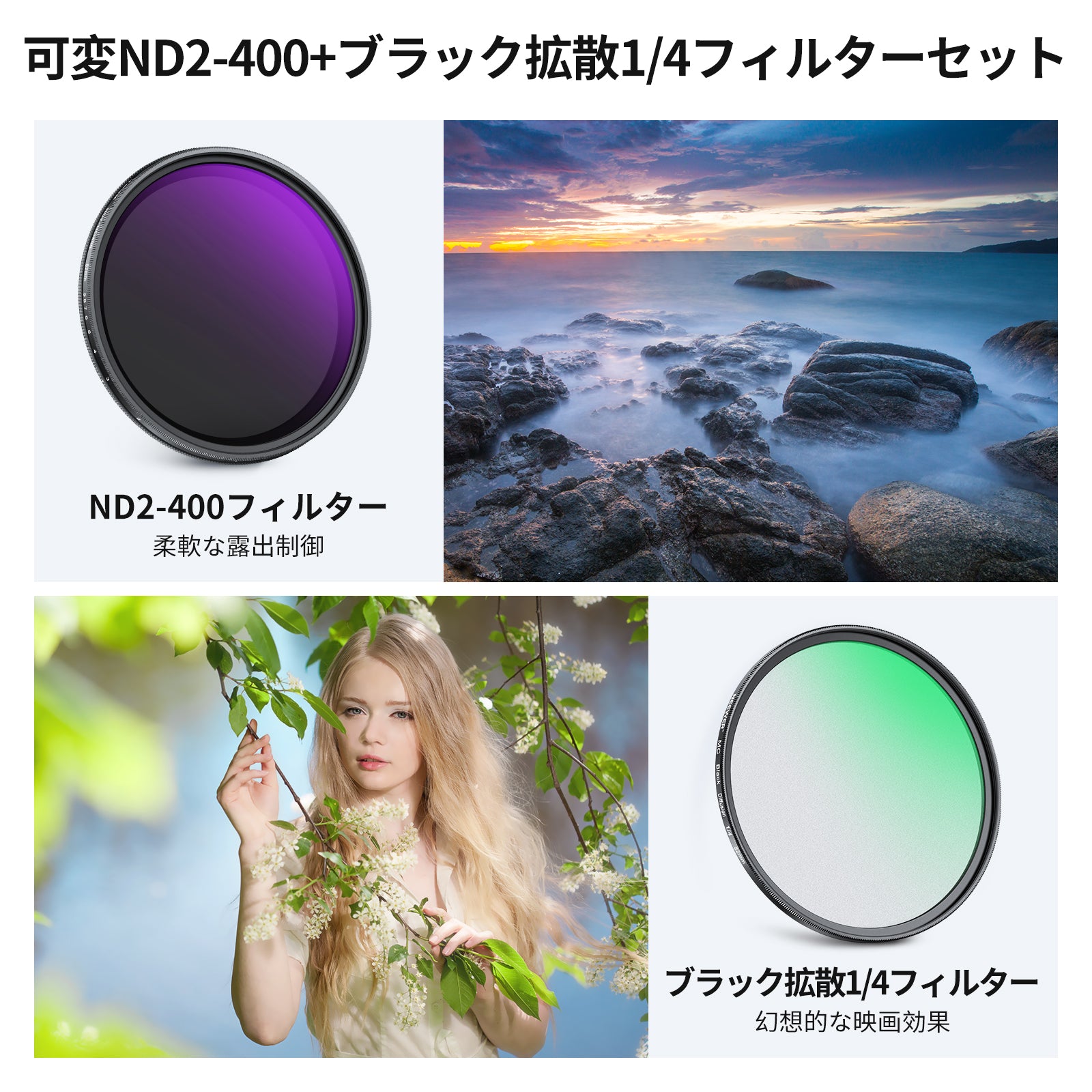 - 【柔軟な露出制御】可変ND2-400フィルターは、1-9ストップ減光効果を提供します。正確なストップ数まで回すことで、希望のND値と優れた露出が得られます。ご注意: 絞り開放で暗いXパターンが表示される場合があり、2枚偏光フィルターの特定角度で配置されている可変NDフィルターは、特定レンズおよび焦点距離と相互作用する際に発生する正常な現象です。可変NDフィルターは、ストラップ付きの保護キャップが付属しています。