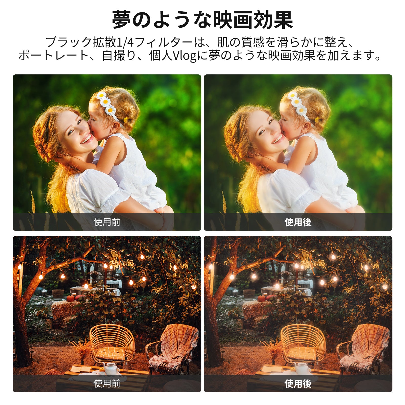 - 【映画拡散効果】ブラック1/4"拡散フィルターは、肌の質感を滑らかにし、ポートレート写真、自撮り写真、個人Vlogに夢のような映画効果を加えます。